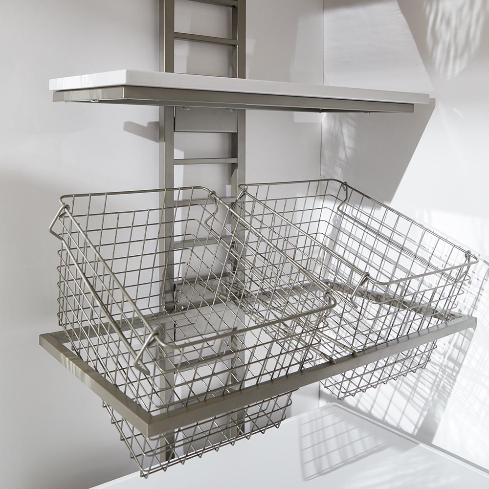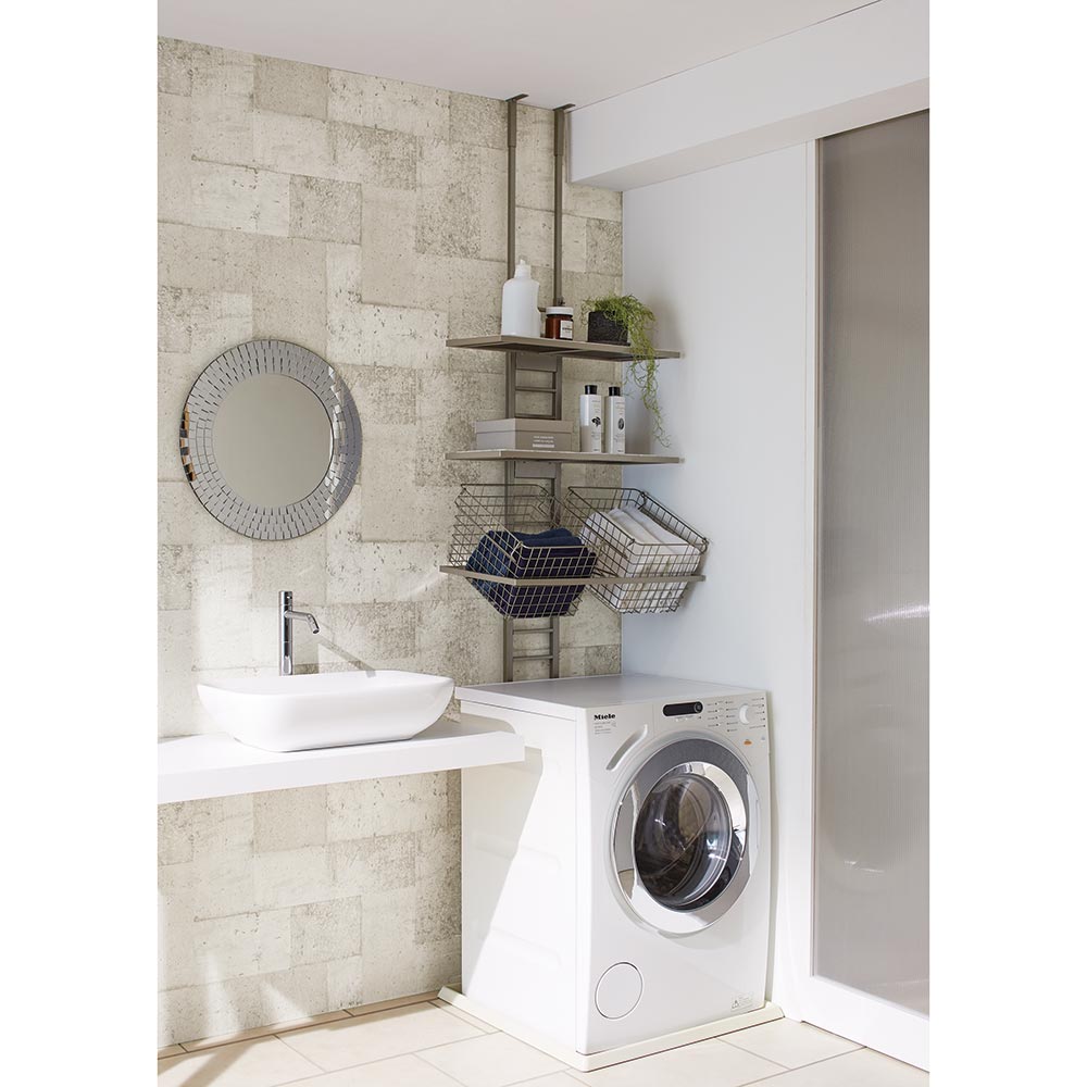 • 棚2段・バスケット2個タイプ。マットで落ち着いたニュアンスシルバーで仕上げた、ホテルさながらのランドリールームを演出する洗濯機上ラック。安心の天井突っ張り式ランドリーラックです。