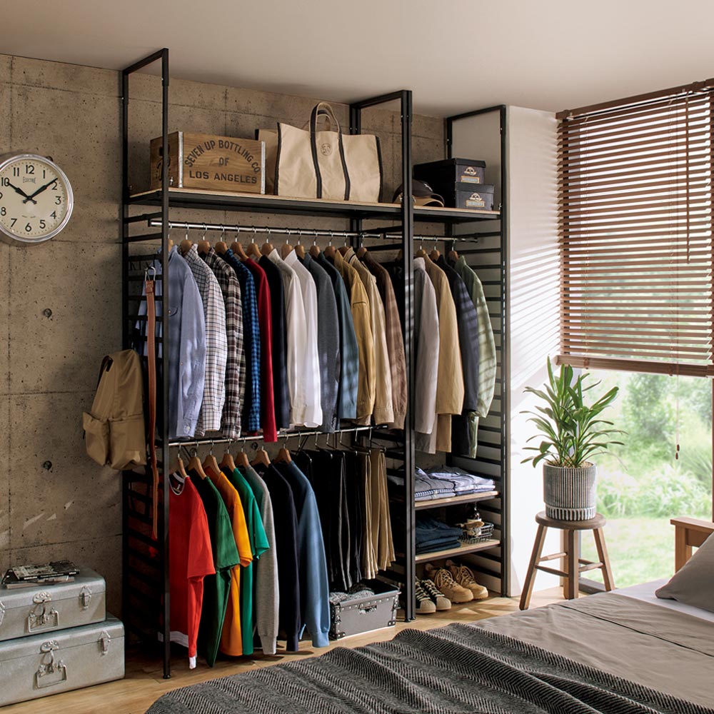 衣類はもちろん本やオーディオ、インテリアグリーンなど、壁一面にお気に入りをディスプレイ。 深すぎない、ほどよい奥行43cmでさまざまな物の収納に便利です。背板がなくサイドフレームも抜け感のあるラックなので、2台並べても圧迫感がありません。