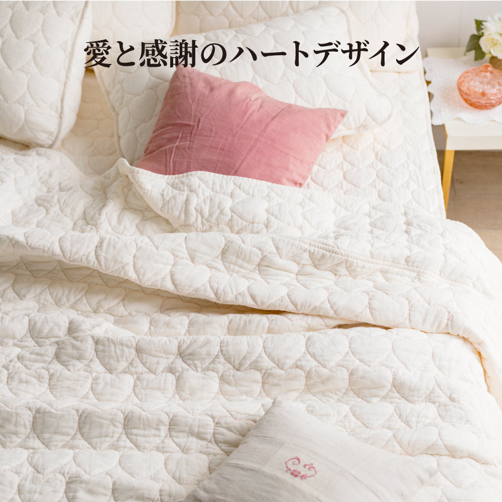 ふれるたび眠るたび、幸せ気分になれるハートのデザインです。パシーマ(R)ならではのふっくらキルトを、心ときめくハートパターンで施しました。落ち着いた色合いのピンクで施したハートのキルトは、可愛いのにさりげなくて目に入るたびハッピーな気分にしてくれます。