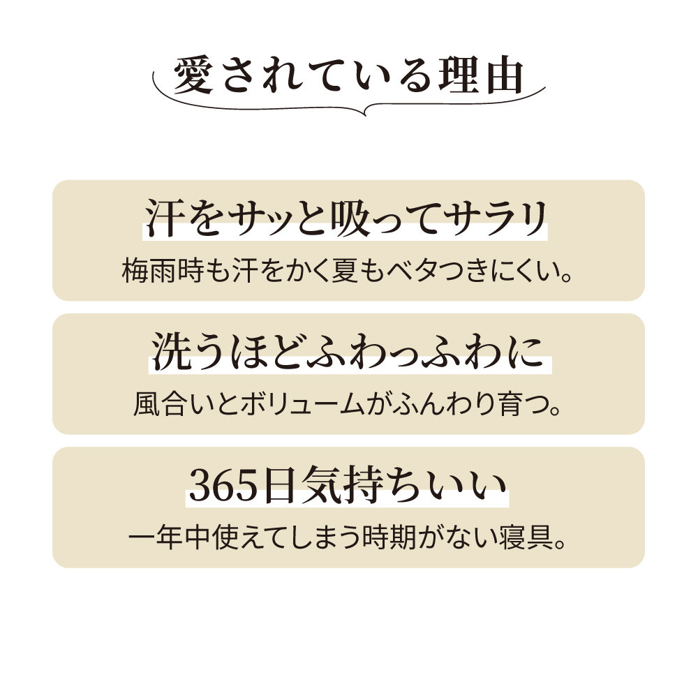 洗えば洗うほどふわふわに育つ。ガーゼがやわらかく馴染んで手放せなくなる肌ざわりに。洗うことで中の繊維がほぐれ、空気を含んでふんわり軽い掛け心地になり、風合いが育つことで愛着も増します。(ネット・柔軟剤は使わずに洗ってください。)