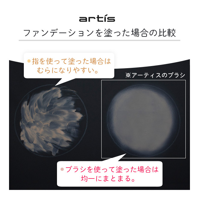 基本のリキッド、パウダーはもちろん、流行のクリームタイプもOK。少量でムラなく広範囲に塗れるからファンデーションの節約にも。肌を美しく見せるなら高価なファンデーションより、このブラシがおすすめ!ファンデーションも何度も買い替えるより、良いブラシを1本持っていた方が、長く使えて断然おトクですよ。【アーティスとは】