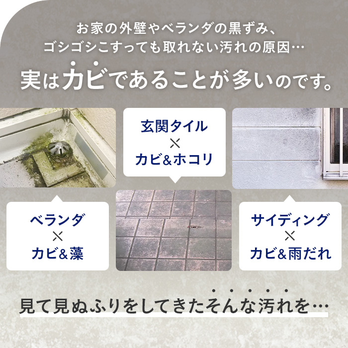 お家の外壁やベランダの黒ずみ、ゴシゴシこすっても取れない汚れの原因、実はカビであることが多いんです。見て見ぬふりをしてきたそんな汚れ、ビーオでキレイにしてみませんか?外壁の雨だれの跡やベランダの床、排水溝まわりの藻、もちろんお風呂場の頑固なカビもピカピカに!さらにビーオがスゴイのは従来のカビ取り剤では使用不可だった「木材」にも使えること。カビと日焼けを同時に除去できるので、お庭のラティスやデッキチェアが見違えるほどキレイになります。