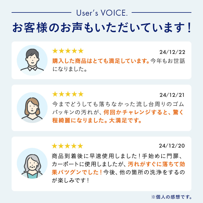 ※環境、汚れの度合いにより効果は異なります。※酸性タイプの製品と一緒に使うと塩素ガスが出て大変危険です。