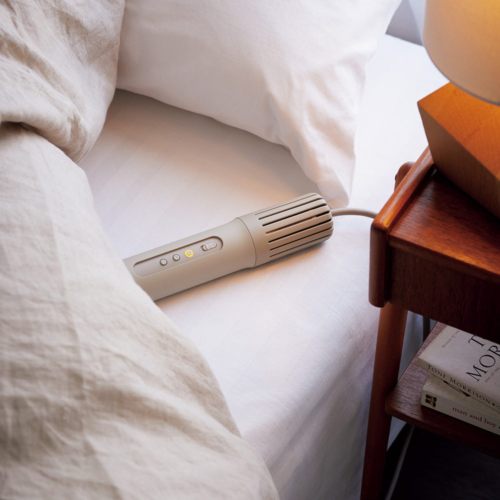 コンパクトなのにパワフル大風量!高級家電ブランド「カドー」のスティック型布団乾燥機で、ジメッとした布団がふかふか、ポカポカに。