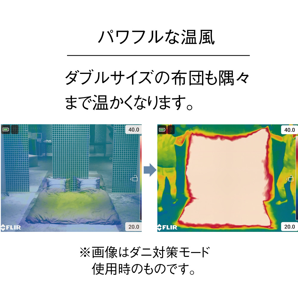※ふとんの耐熱温度が70℃以上であることを確認してください。特に機能性寝具(低反発や高反発素材・ビーズ素材・パイプ枕など)は温風の温度により機能を損なうことがありますので、必ず確認してください。