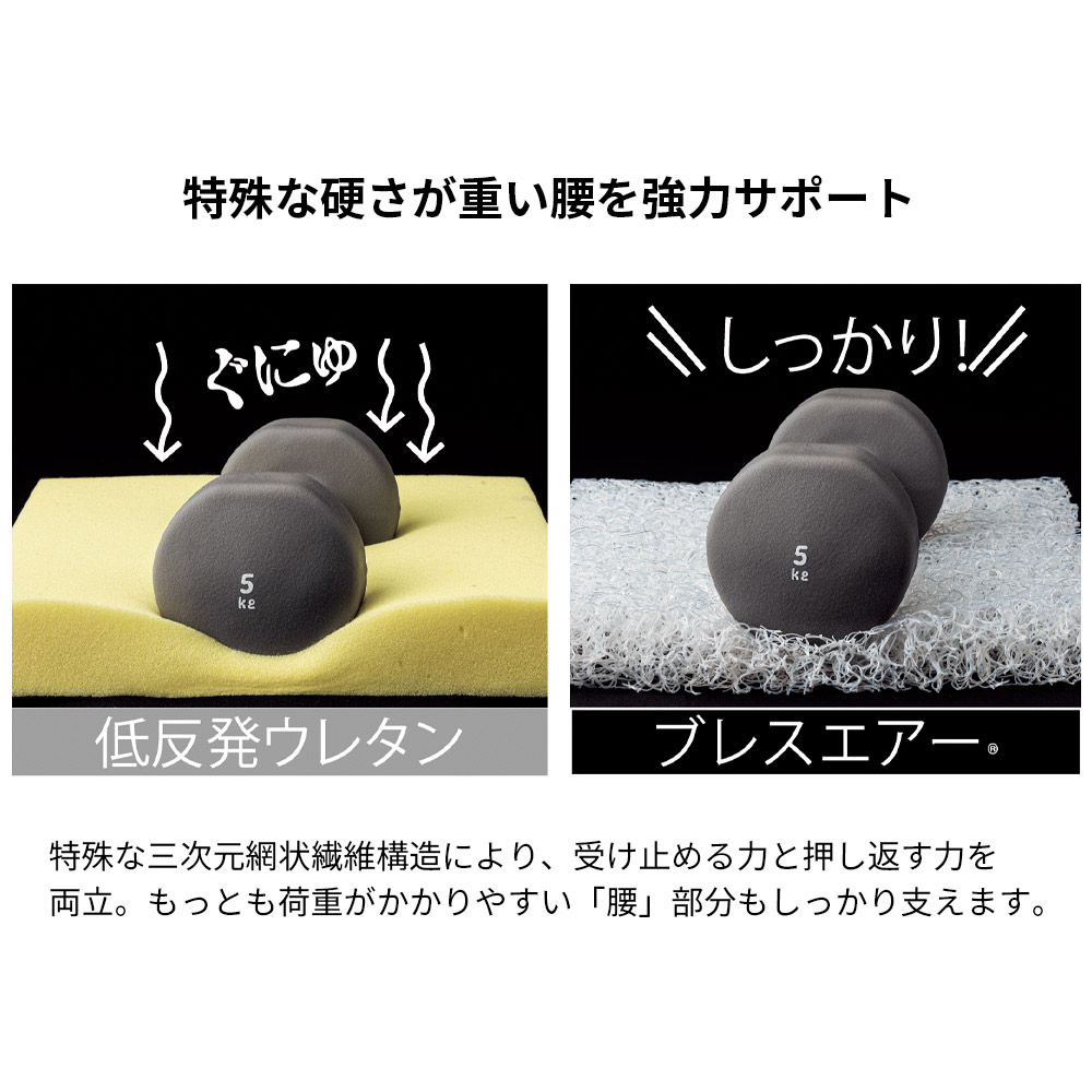 肩腰を支えるロングセラー寝具!しっかりタイプのブレスエアー(R)素材を使用し、薄くて軽いのに全身をパワフルに支えます。