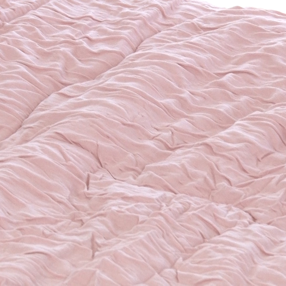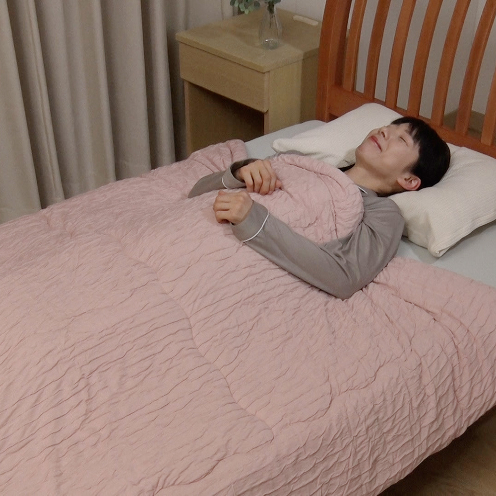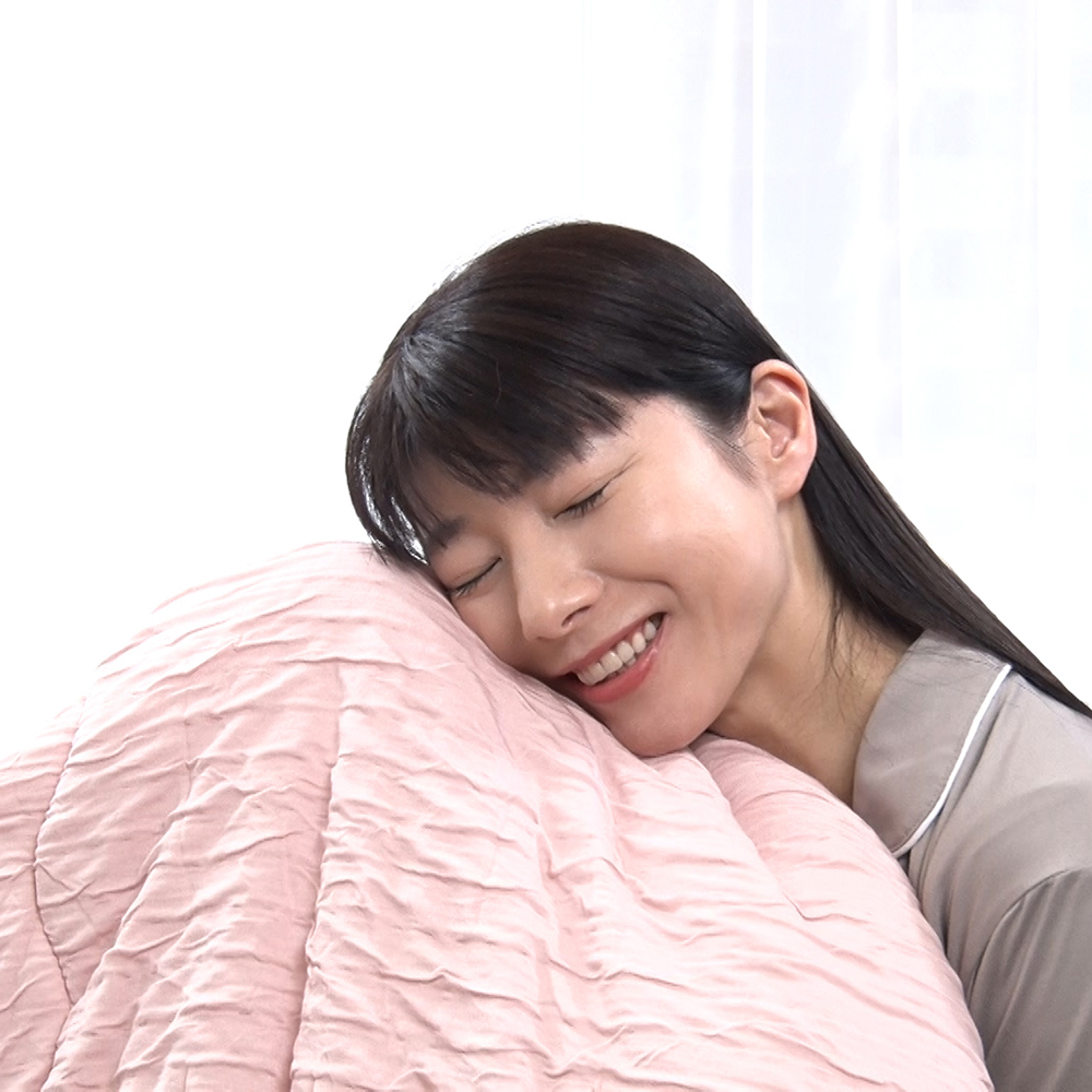 触れた瞬間、何よりうれしいのが肌触りのよさ!くしゅっとして柔らかく、フワッフワで、とにかく気持ちがいいんです。その秘密は「側生地」と「中わた」に。柔らかさとふんわり感に徹底的にこだわり、まるで繭に包まれているような気持ちよさを実現しました。肌触りが気持ちいいと寝入りもスムーズになりそう。