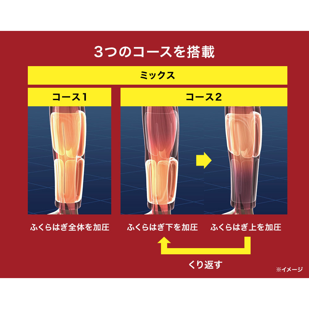 コース1(5分):ふくらはぎ全体を一度に加圧・解放し、筋肉の収縮と弛緩をサポート