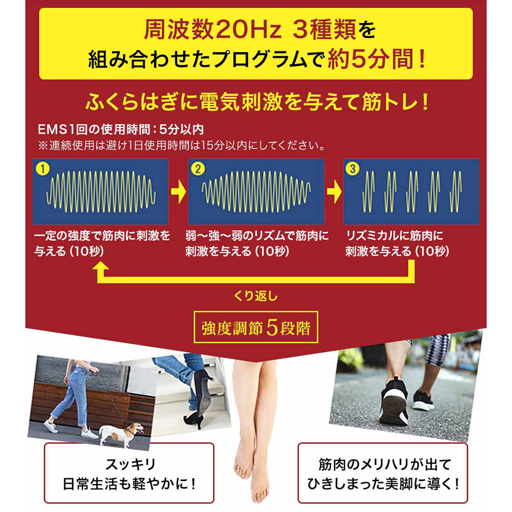 エアーのストレッチで筋肉が柔らかくなったところにEMS で刺激すると、筋トレ効率がアップ。ふくらはぎに適したEMSによる約5分間のトレーニングで、ふくらはぎの引き締めも目指せます。