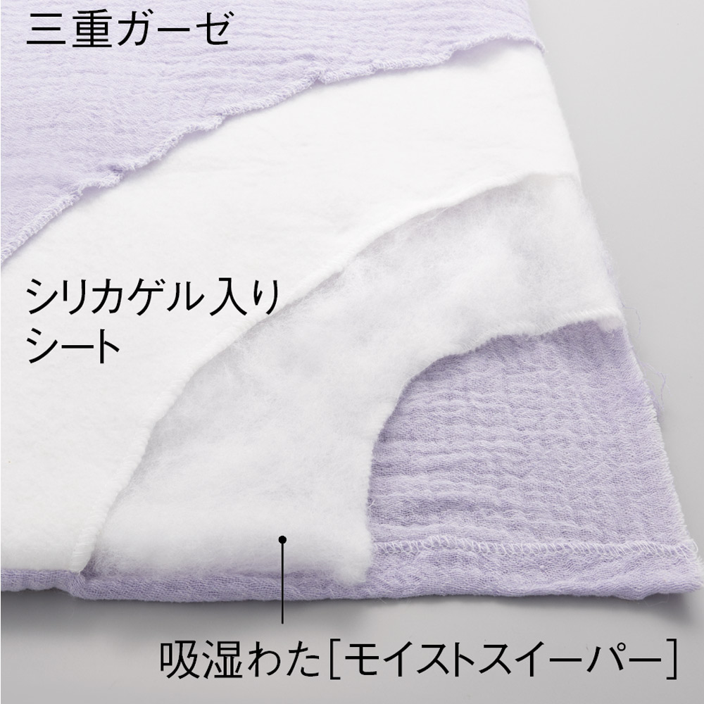 吸湿わた「モイストスイーパー」が布団内の湿気を吸収。さらにシリカゲルシートが素早く吸収した汗や湿気を発散。まるで呼吸するように“吸って逃す”を繰り返して、寝心地爽やか。【ポイント2】三重ガーゼで肌ざわりふんわりなめらか