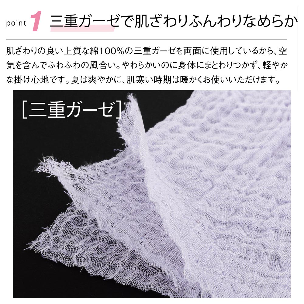 肌に当たる面には厳選した綿100%で仕立てた三重ガーゼを使用。さらっとしつつも天然素材のやさしい肌ざわりです。【ポイント3】洗濯機で丸洗いOK