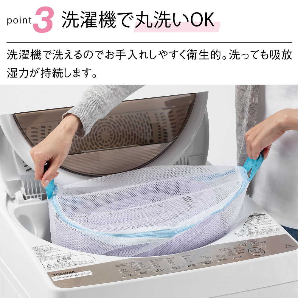 洗濯機で洗えるので手入れしやすく衛生的。洗っても吸放湿力が持続します。商品画像の説明