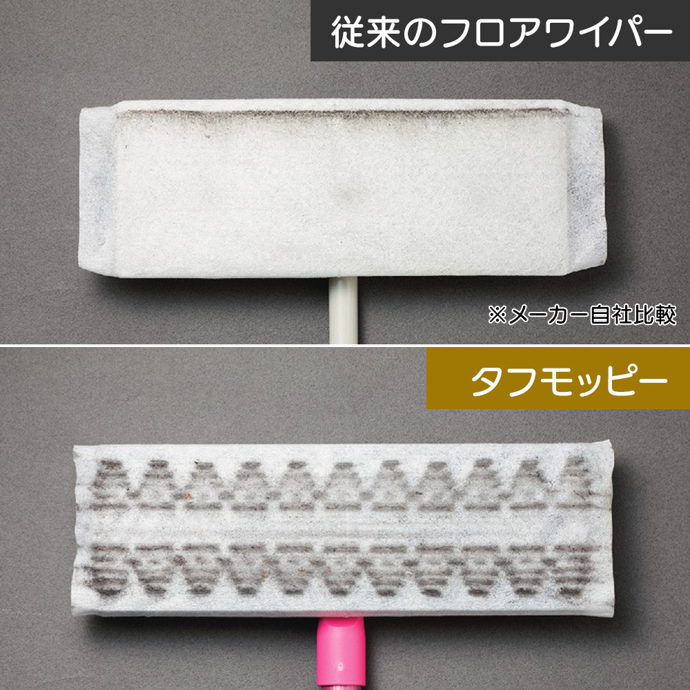 使い方は、付属のクロスの上に本体を置いてセットすればOK。「こういったモップなら家にもある…」という方もいると思いますが、想像しているものとは汚れ落としのパワーがかなり違うはず。◎実は、裏面がフラットの軽量モップは、ドライシートの場合、汚れを落とすというより髪の毛やホコリを集めるのに特化したものが多いんです。でもタフモッピーなら、独自構造ヘッドが床をつかむように密着し、汚れをしっかりキャッチ!フローリングの目地の汚れまで一掃します。