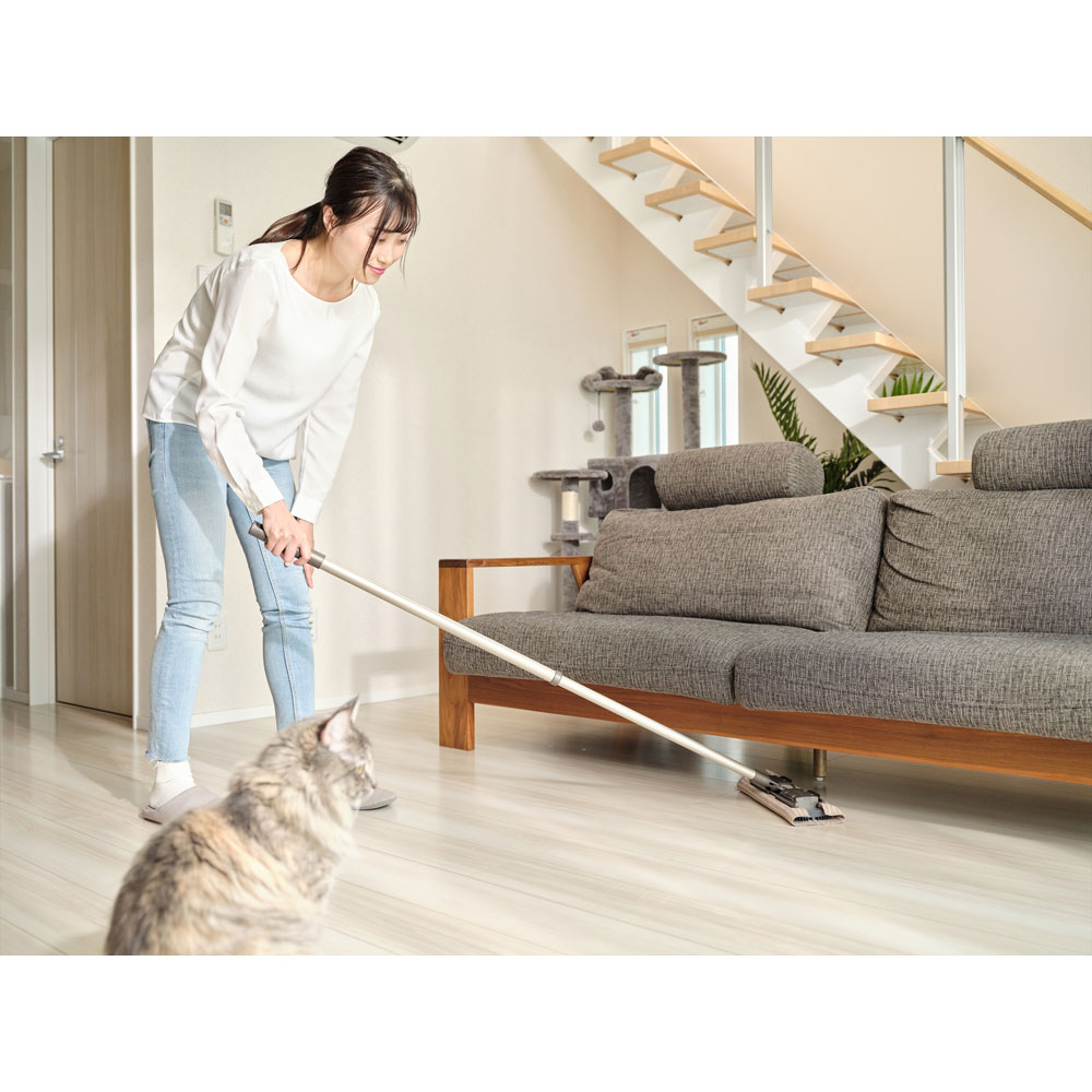 掃除機をかけた後のフローリングの床。きれいに見えても、皮脂やホコリなど取り切れてない汚れがこびりついていることも。汚れをしっかり取るには水拭きが適していますが、ゴシゴシ擦っても取れない場合も…。そこでおすすめなのが『タフモッピー ブラッシュ』。立ったまま「水拭き」「乾拭き」の両方ができるモップで、電気を使わないのに、なんと油でベタついた床がスッキリきれいに。その実力から、シリーズ累計約25万本※1の売上を誇る掃除道具のスーパーロングセラーです。※1:2014年11月~2025年5月 シリーズ累計出荷数 メーカー調べ。