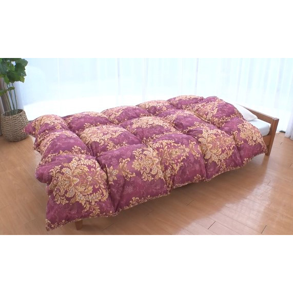 羽毛には「ダウン」と「フェザー」が混ざっていて、柔らかくて暖かい「ダウン」の比率が高いほど、上質と言われています。今回は、貴重で柔らかなダウンを、なんと90%もたっぷり使用。通常、ダウン率50%で羽毛布団と呼べるところ、本品はダウン率90%の高品質羽毛布団なので、かさ高の違いはご覧の通り!ボリュームたっぷり、ふんわり軽く暖かな掛け心地。