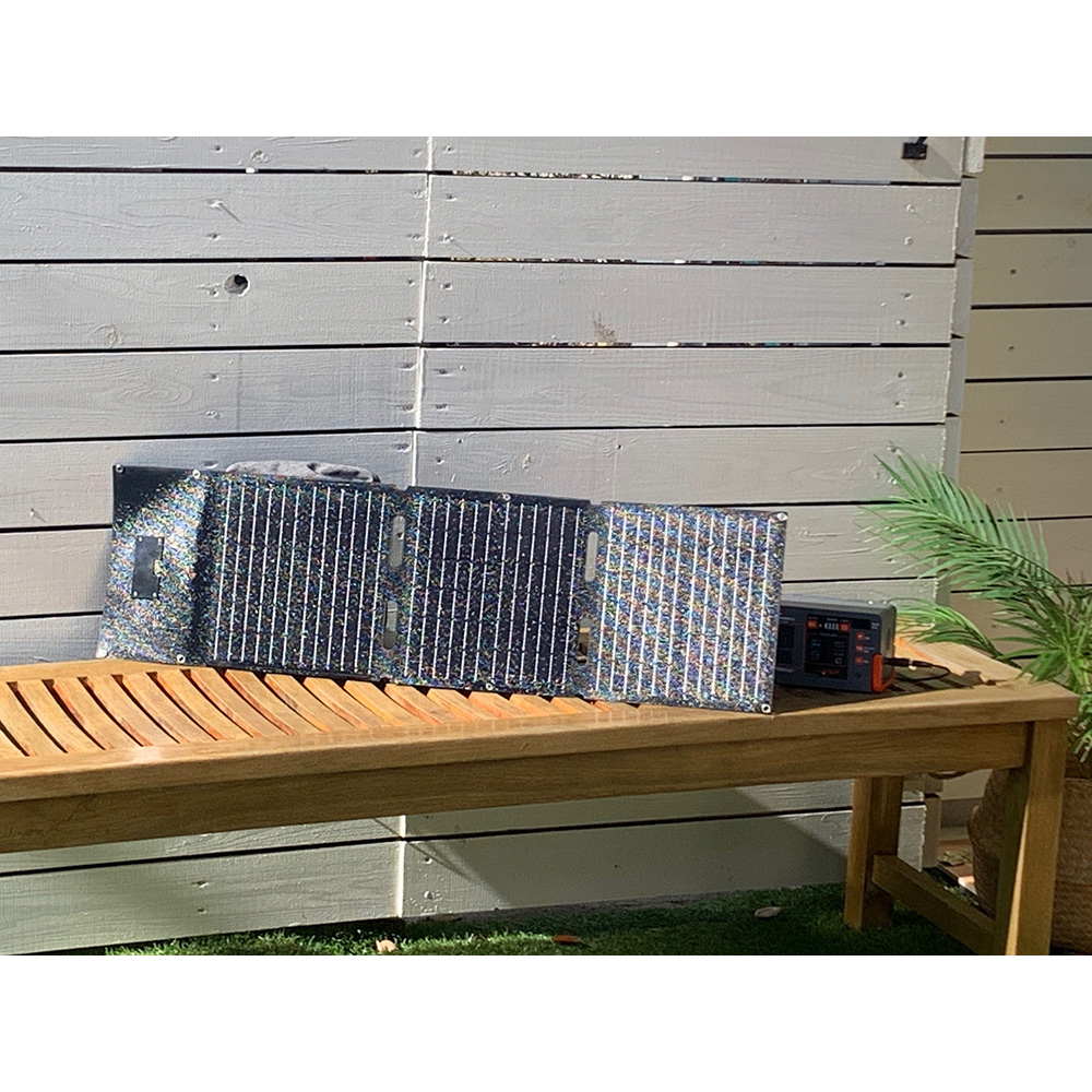 ソーラーパネルのバッグに蓄電池がしまえるので、一緒に持ち運びOK