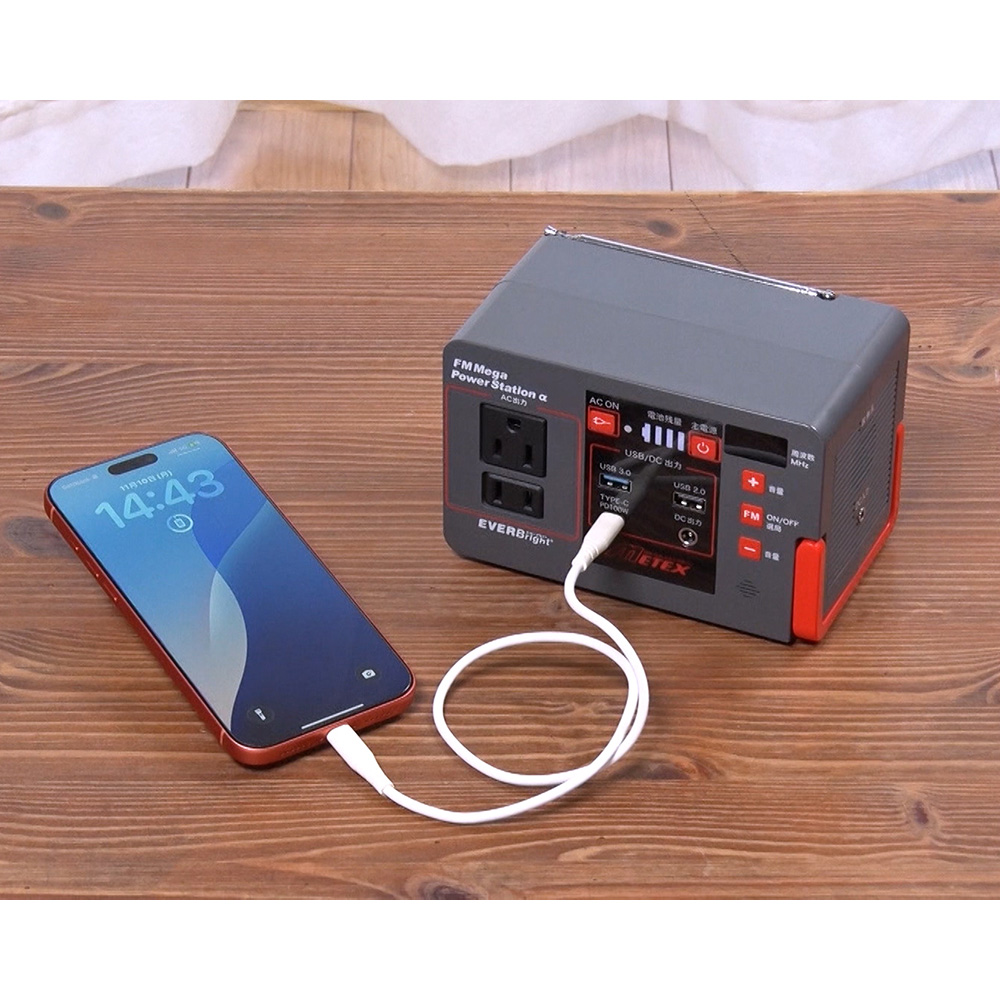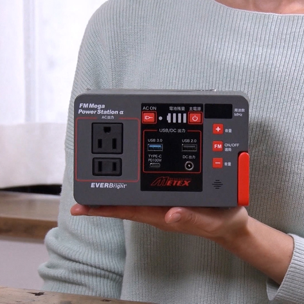 いざというときの備えに!もしものとき、食料品などは準備していても、意外と困るのが電気の備え。『メガパワーステーションアルファ』は、携帯充電や小型家電製品が使用可能な蓄電池。