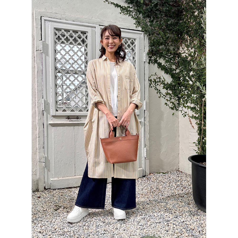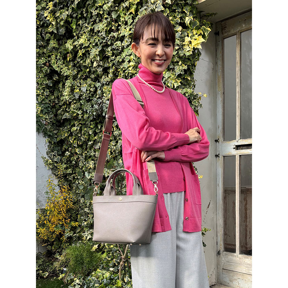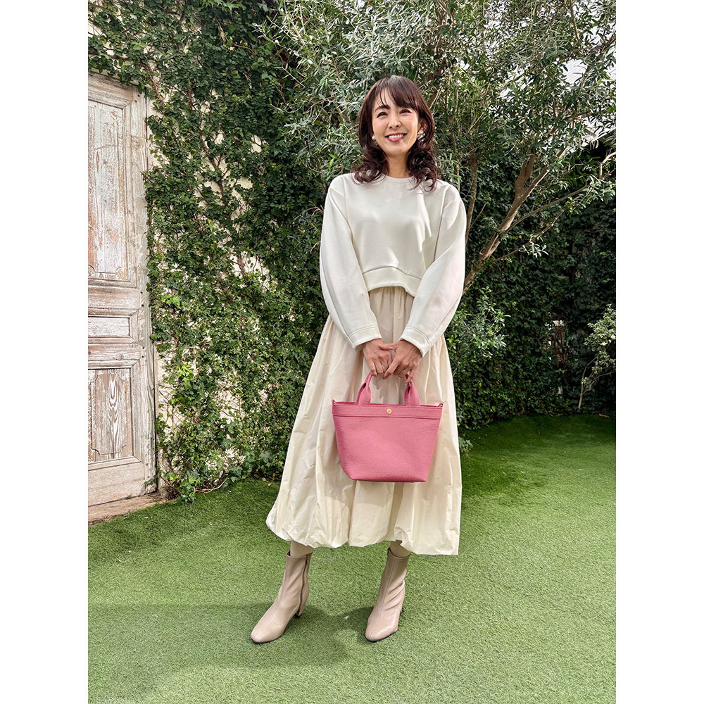 今、バッグも財布もミニがトレンド。特にトートバッグは多くのブランドでも展開するアイテムですが、千秋さんは女性らしい「かわいいサイズ感」にとにかくこだわりました。流行のフェミニンな装いにぴったりで、カジュアルにも合わせやすく、上品でおしゃれな印象に見せてくれるのはさすが。お出かけするのが楽しくなりそう。