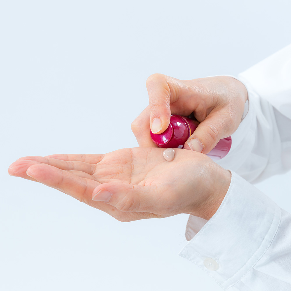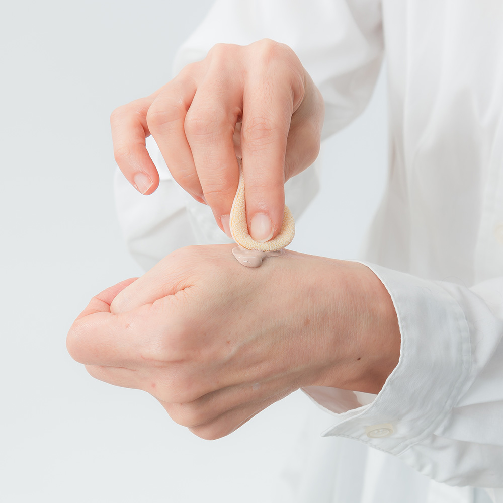 通常のリキッドファンデーションを塗る要領でお使いください。ただし塗った瞬間から膜が張り、引き締めが始まるので、手早く、薄く、塗ってください。
