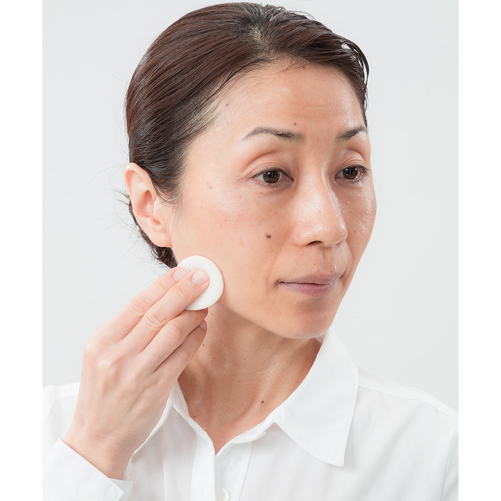 〈1〉洗顔後、化粧水、乳液等で、お肌をしっかり保湿してください。〈2〉付属のパフに水をたっぷり含ませ、下から上へ引き上げるように通常のファンデーションを塗る要領で伸ばしてください。顔全体で1~2プッシュが目安です。