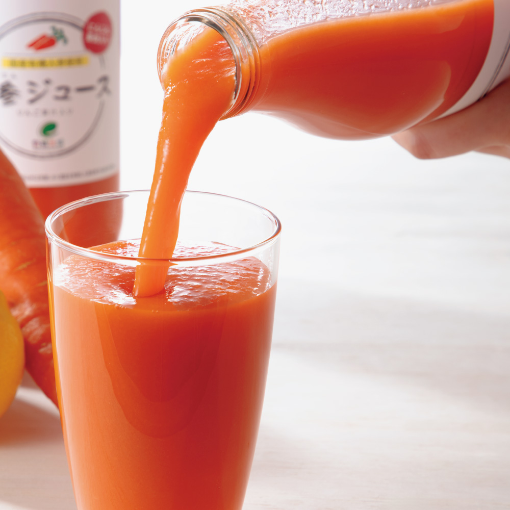 水を一滴も加えずに、人参、りんご果汁、レモン果汁、梅エキスだけで作った人参ジュース。甘味料、着色料、香料などの添加物は一切使用していません。使用している人参は全て千葉県産有機人参。