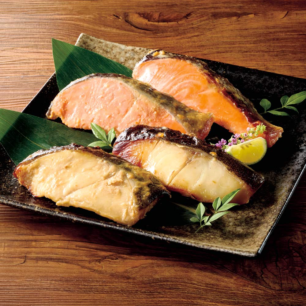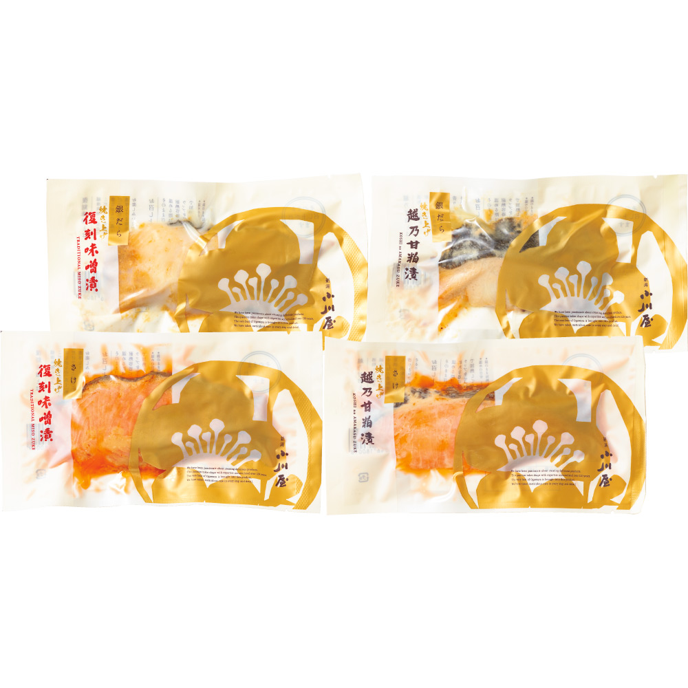 ■内容量:焼き上げ越乃甘粕漬さけ、焼き上げ越乃甘粕漬銀だら、焼き上げ復刻味噌漬さけ、焼き上げ復刻味噌漬銀だら 各1切れ