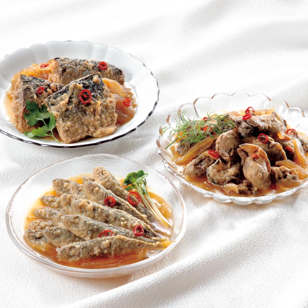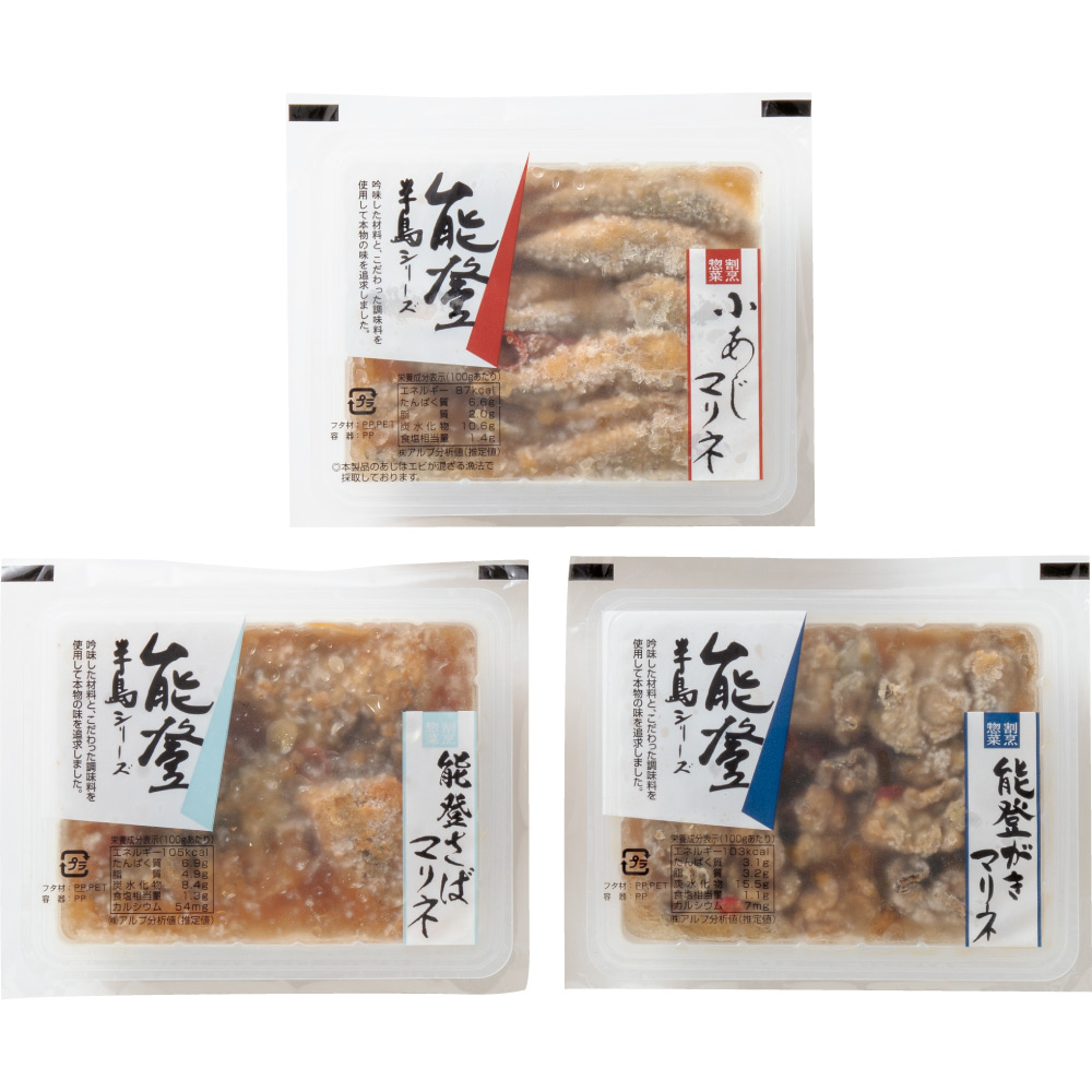 能登沖で獲れた豆あじ、能登産かき、能登産の真さばを使用し、食用のなたね油でカラッとで揚げ、純米醸造酢、丸大豆しょうゆを中心にしたメーカー独自のこだわりのタレに漬けこみ、南蛮漬風のマリネに仕上げました。