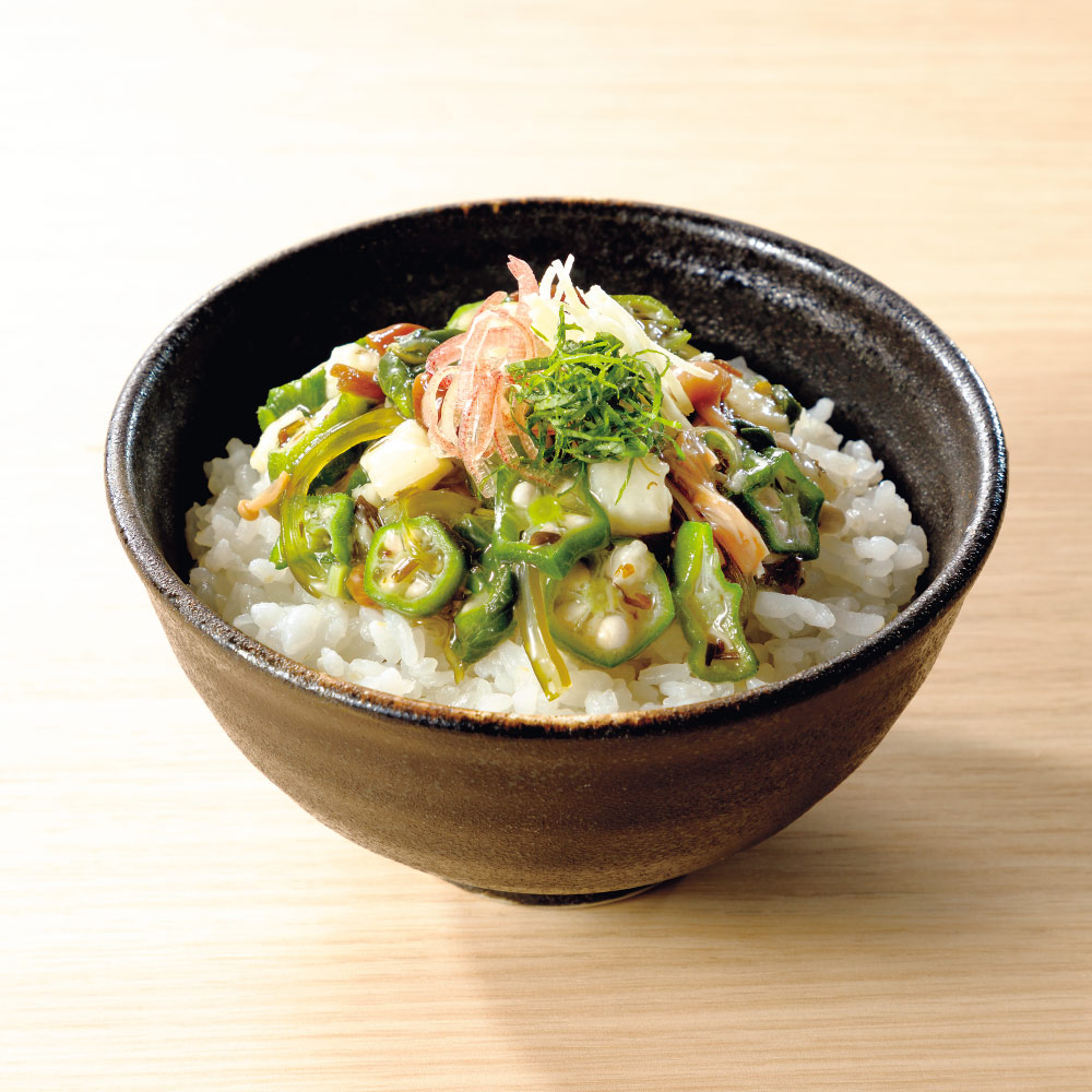 国産の長芋に、めかぶ、茎わかめ、アカモクなどの海藻と、オクラ、なめこ、なめ茸、モロヘイヤなど、8種を合わせたツルリとしたのどごしのネバネバ惣菜。