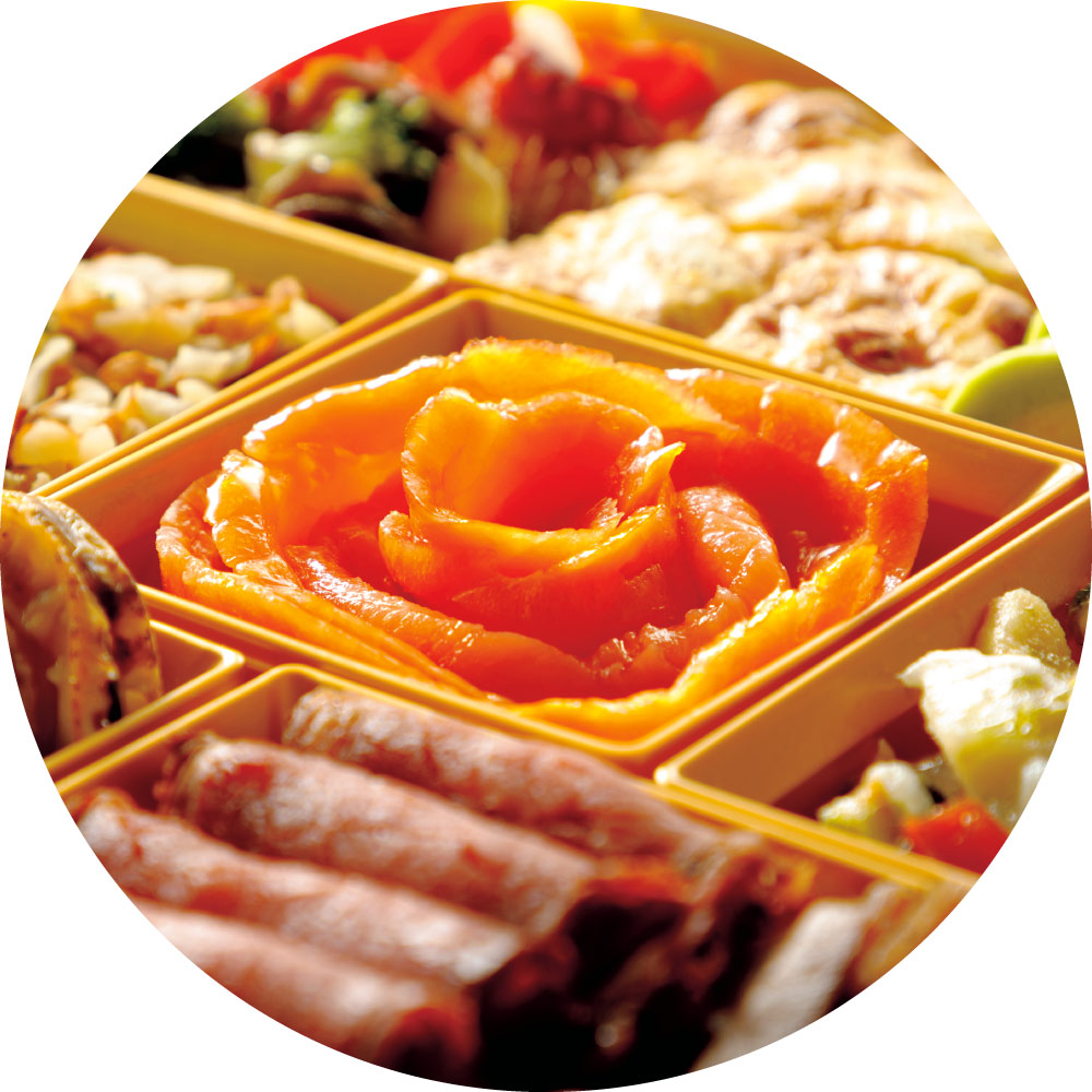 タコのマリネ、キノコとブロッコリーのバジル香味、ハーブチキンのチーズキッシュ、地どりのテリーヌ、レッドキャベツピクルス、プルーン、ポークリエット、スモークサーモントラウト、ニシンのレモンマリネ、海老とブロッコリーのテリーヌ、帆立貝香草焼 ロマネスコ添え、ローストビーフ ソース付、牛蒡の赤ワイン煮、オリーブ