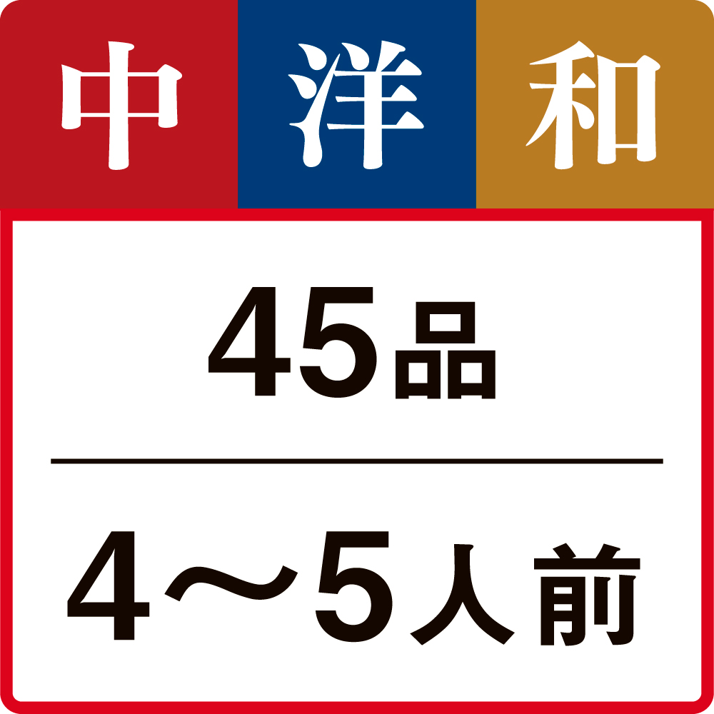 料理に定評のある「ハイアット リージェンシー 東京」総料理長の監修による三段重。祝海老や赤魚西京焼など和の重、キッシュやテリーヌ、リエットなど洋の重、海老チリソース、サーモントラウト巻、中華風焼帆立など中華の重。上品な仕上がりの45品が華やかに並びます。