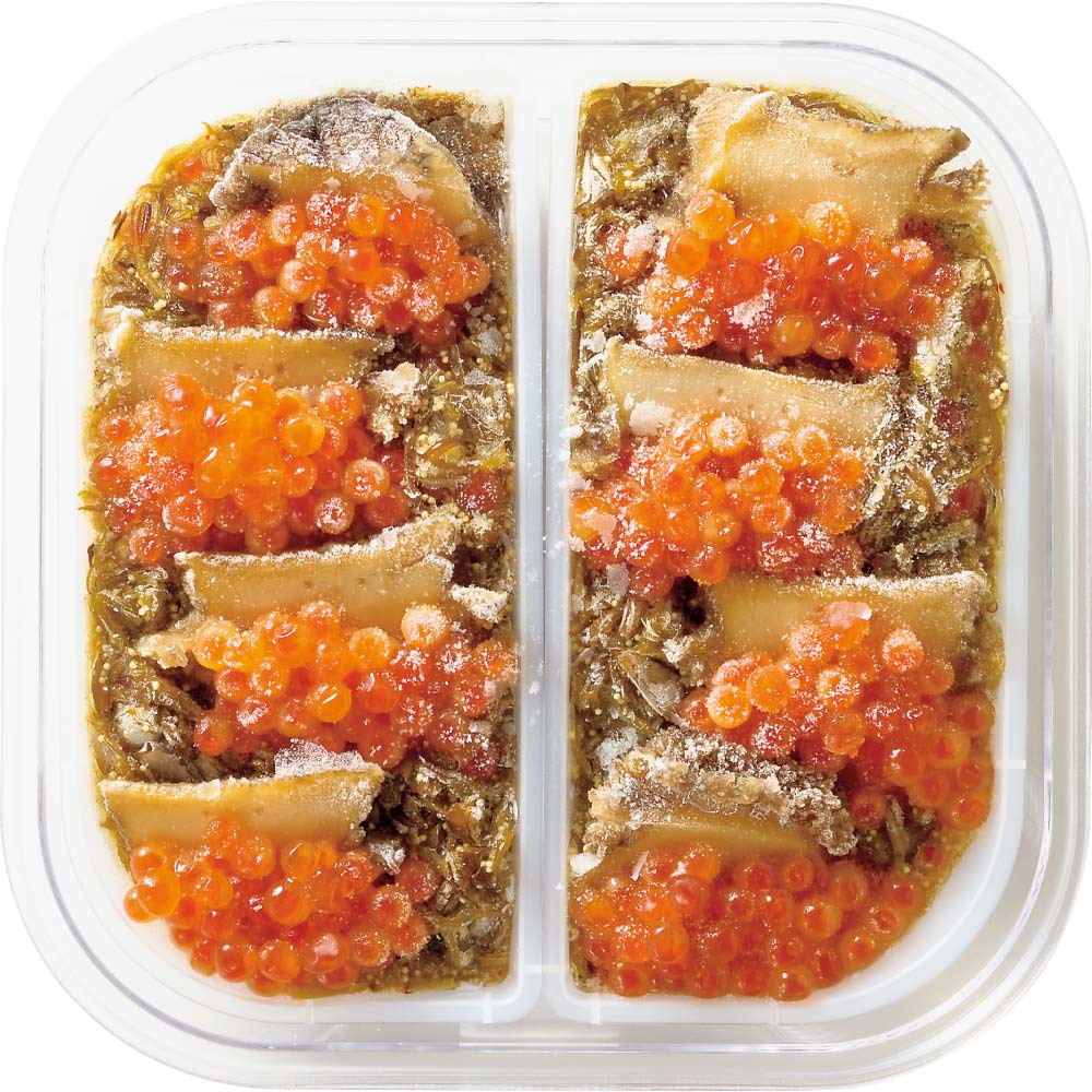 豊富な魚介類の中から上質素材だけを厳選し、しょうゆベースの秘伝のたれに漬け込みました。材料は、やわらかく煮上げたあわび、とろける食感のいくら、カラフトシシャモの卵、芽かぶ。これらが絶妙のバランスで入っていて、それぞれの風味や食感が楽しめます。