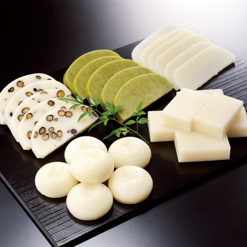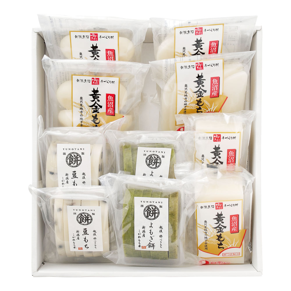 粘りとコシが強く、焼いた時の美味しさは格別と、ディノスで長年愛され続ける、常に人気の「黄金もち」。手水を使わず、蒸し上げたお米の水分だけでついた、昔ながらの製法にこだわっています。香り豊かなよもぎもち、黒豆が香ばしい豆もち、お鍋に便利な薄切もち、縁起の良い白丸もちと白角もちの合計5種のバラエティセットです。