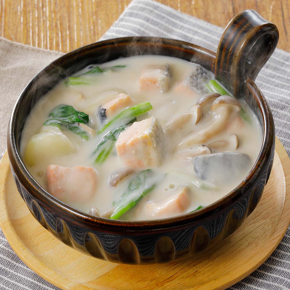 ・クリームシチュー:冷凍のままの秋鮭を、シチューの具材と一緒に煮込むだけ。鮭の旨みがシチュー全体に広がります。