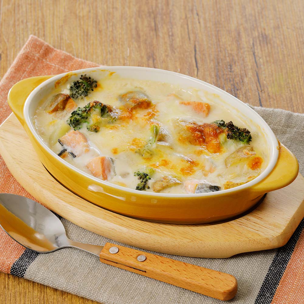 ・グラタン:凍ったままの秋鮭をホワイトソースに混ぜ、トッピングにチーズをのせて焼くだけで美味しいグラタンが完成します。