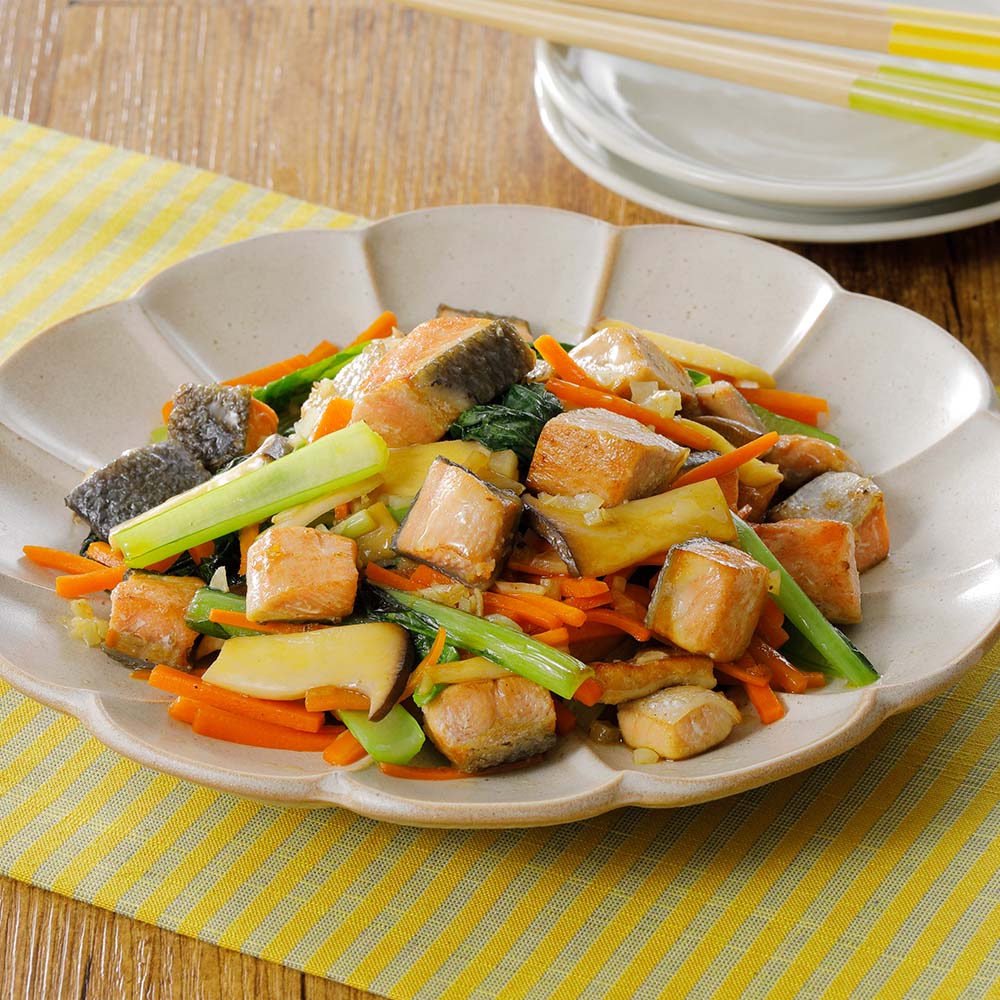 ・野菜炒め:秋鮭と冷蔵庫にある野菜を一緒に炒めるだけで、栄養満点の一品が出来上がります。