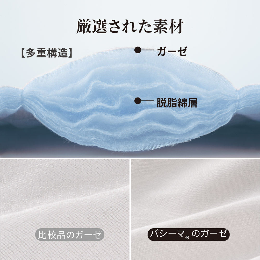 一般的なガーゼより目が詰まっていて耐久性があり、ホコリが出にくいのも特長です。仕上げ剤は一切使用せず、人体への安全性を示す国際規格「エコテックス100」で最も厳しい「クラスI(乳幼児製品)」を取得しています。だからこそパシーマは、お肌の弱いお子様、デリケートな肌のご年配の方まで、幅広い方々に安心してお使いいただいています。