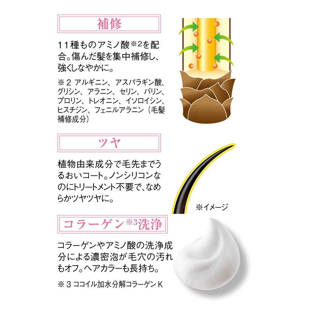髪とに近い成分の11種のアミノ酸※4が、集中補修し、さらに潤いを与えてコート。毛先まで滑らかな指通りとツヤを実現します。