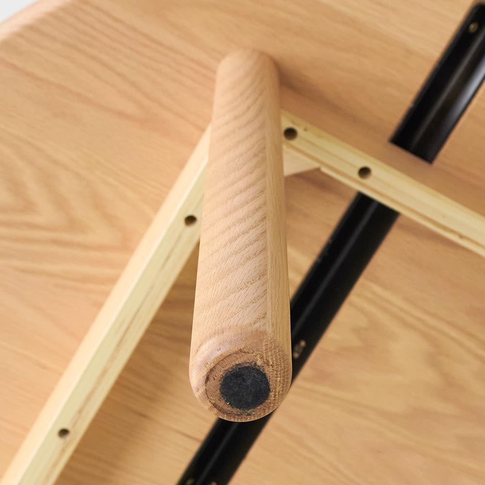 天板のフチも丸く仕上げ、手触りも滑らかで優しい風合いに。たっぷり厚みのある27mmの板を使用することで、無垢材ならではの丸いカーブが引き立つ仕上がりに。