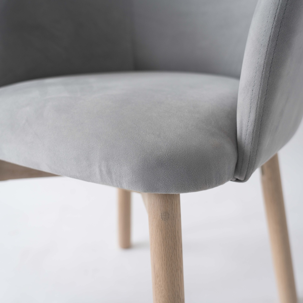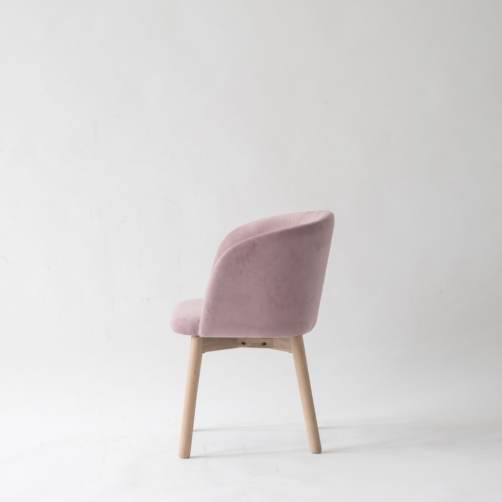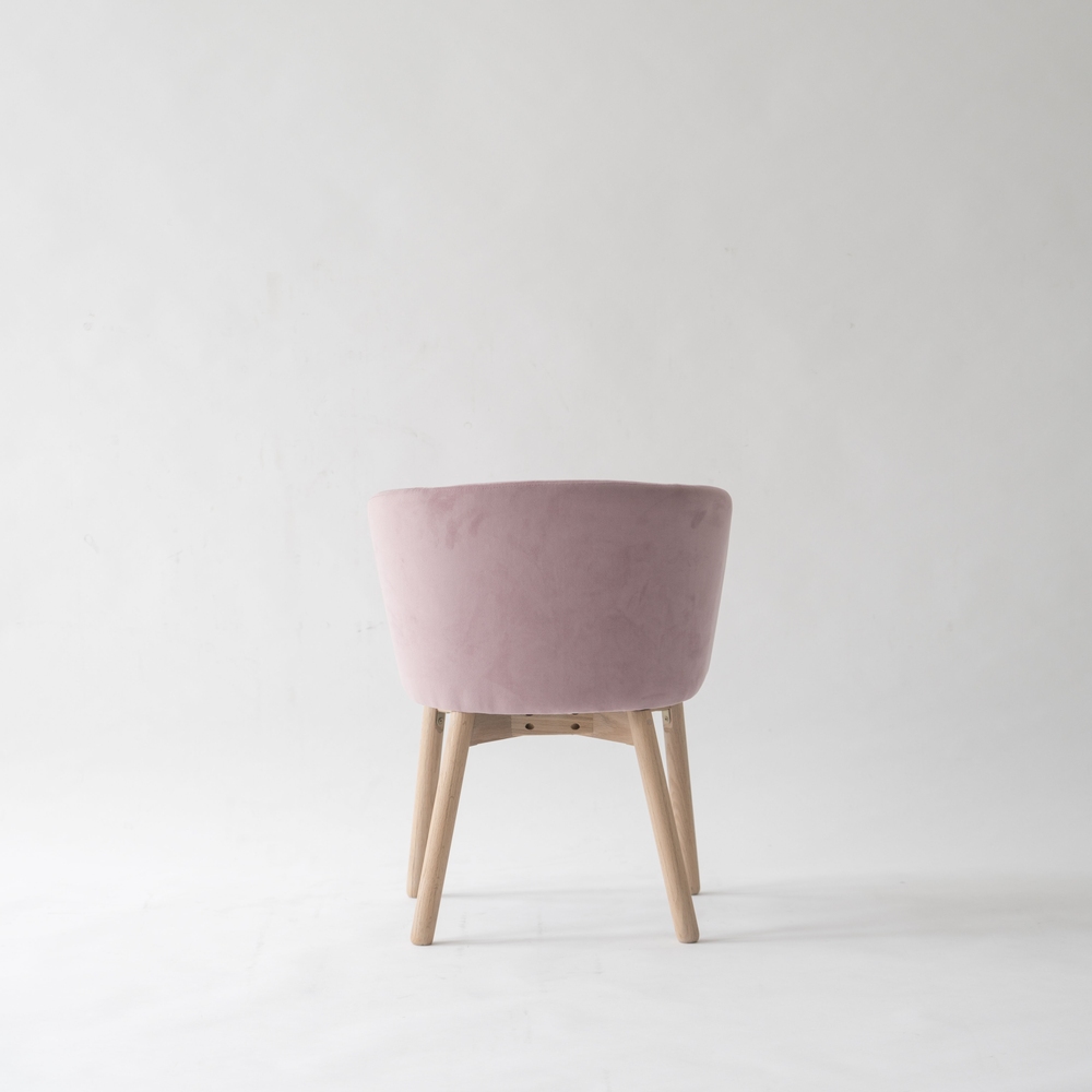 背面も共布のベロア素材。丸いカーブでより光沢のある生地が美しく映えます。普段、椅子は背中側を見せていることが断然多いもの。だからこそ、後姿の美しさにもこだわりました。