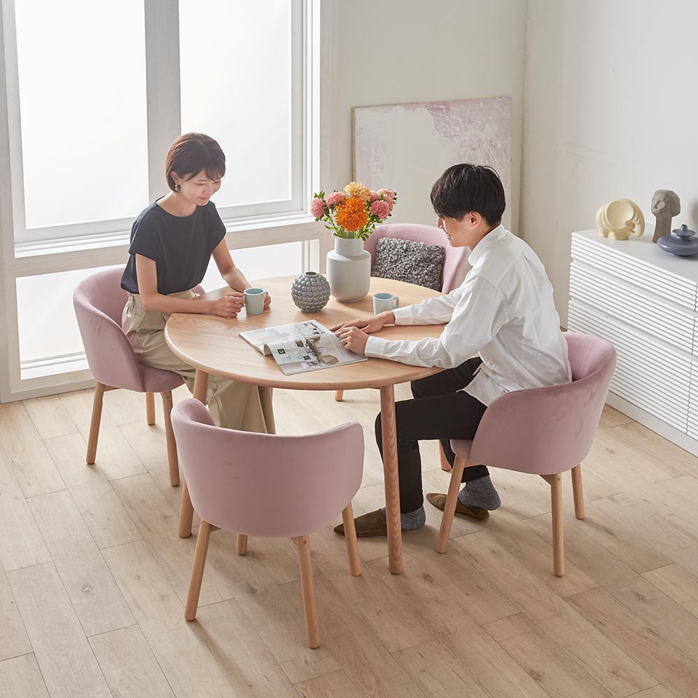 コーディネート例(ア)ピンク 丸型テーブルは、サイズ感がコンパクトでも、角がないので大人数でゆったり座ることができます。
