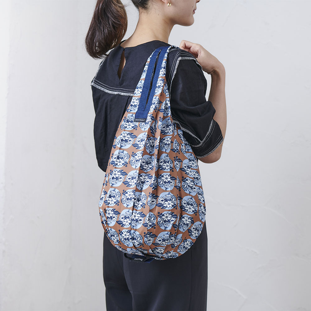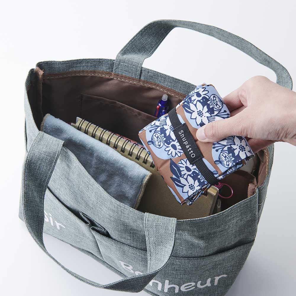 「Drop」はどんなスタイルにも合うタテ型。袋口が自然にすぼまり、中身が見られにくい「しずく」形状。袋口が大きく開いてケーキ箱なども入ります。タテ型だから荷物の収まりがよく、電車などで使用している最中も省スペース。いつでもバッグに入れておけるコンパクトサイズ。たたむと薄さ約4cmのフラット形状にまとまり、かさばりません。コンパクトながら見た目以上にたっぷり入る。容量約16L。普段使いのバッグに入れっぱなしにしても、気にならないコンパクトさです。