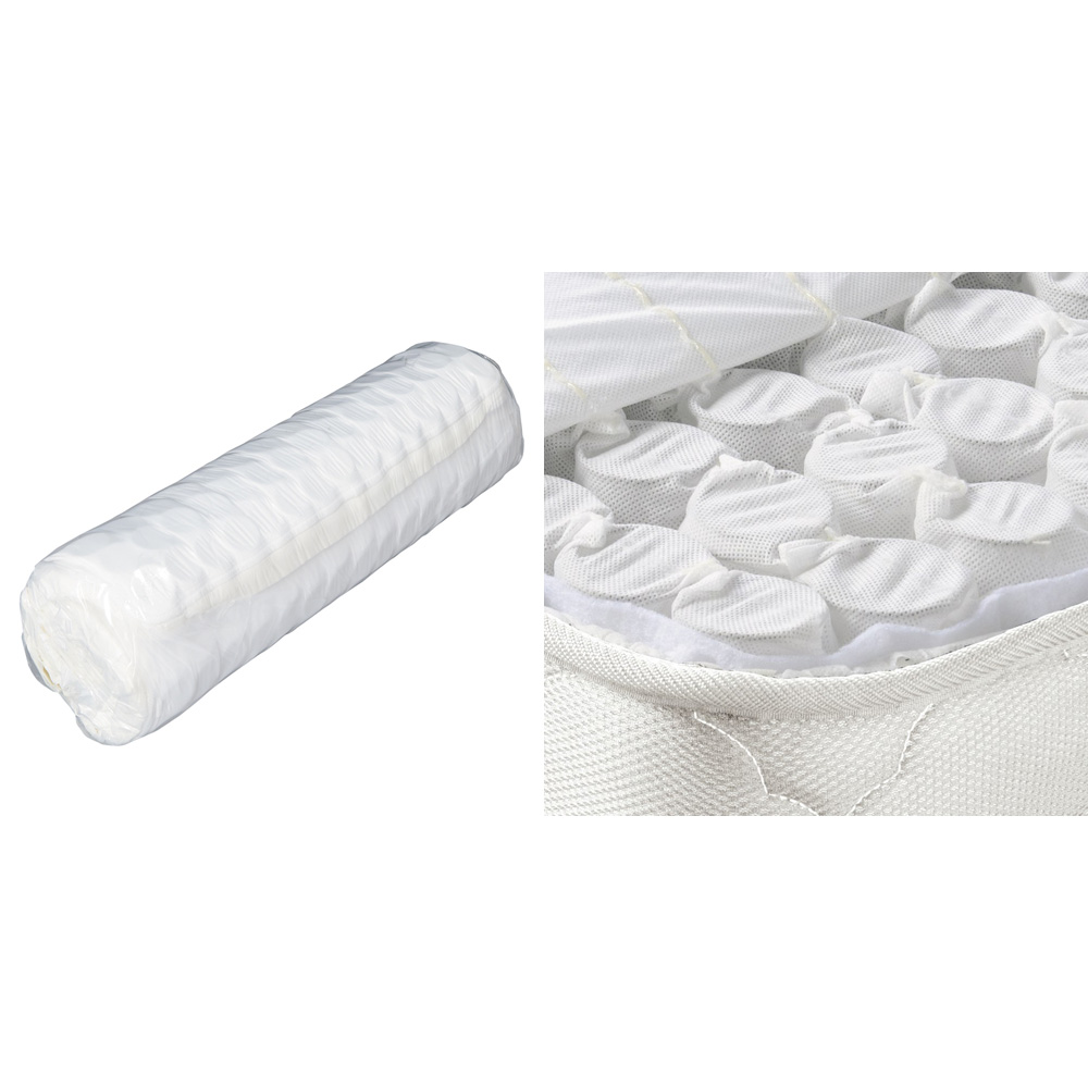 • (写真左)ロール状の梱包を解けば、あっという間にマットレスが復元されます。ラクラク搬入が可能です。(※マットレスはロール状態開封後は返品できません。) (写真右)袋詰めされた個々のポケットコイルが独立して動くため、体のラインに沿ってしっかり点で支えます。