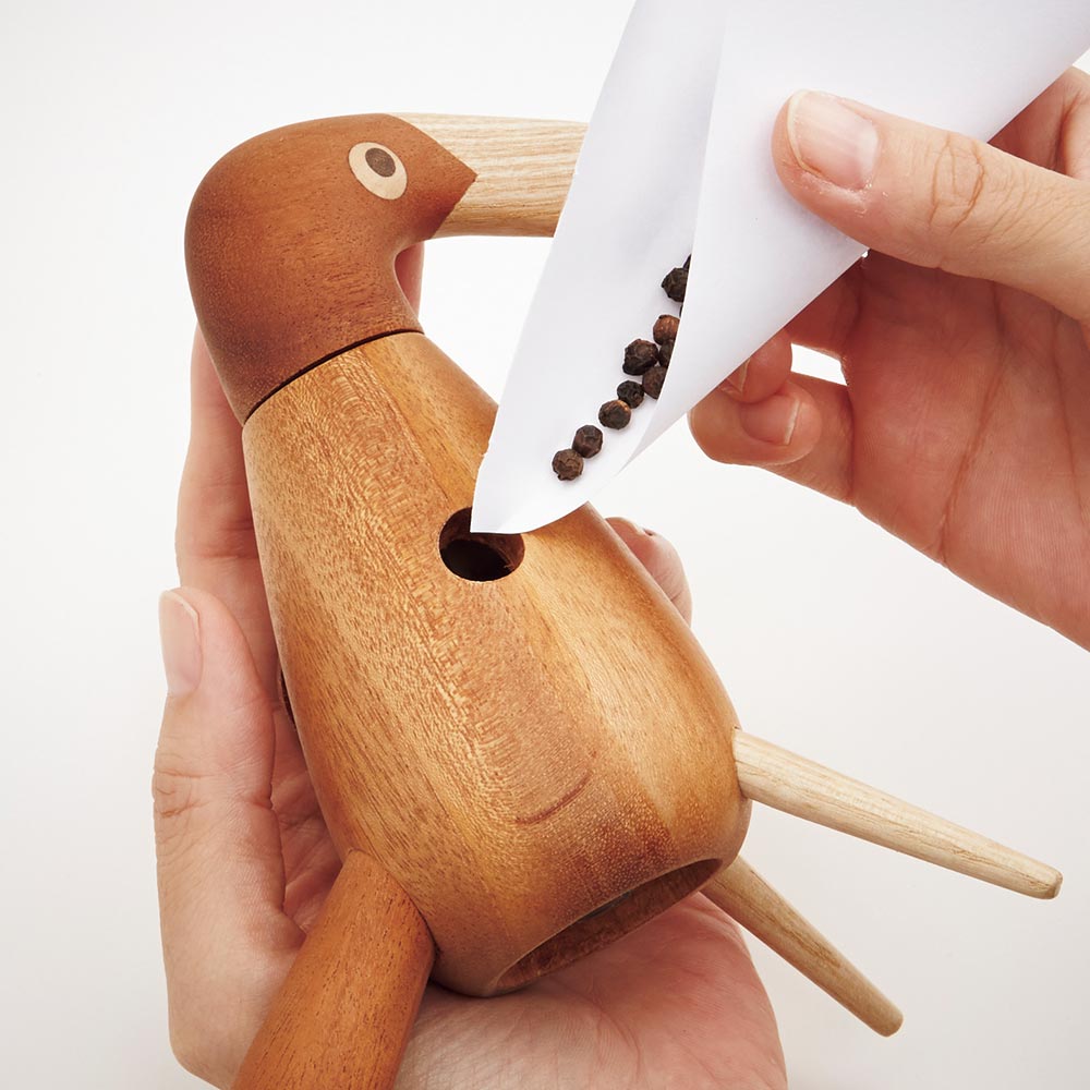 • 羽を外し岩塩や粒胡椒を入れられます。(※写真はペッパーミル バード)