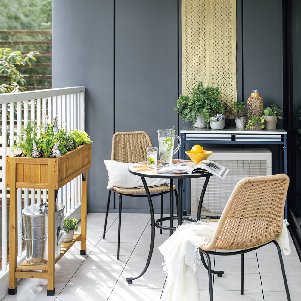 テーブルは華やかな大柄、ベージュやグレイの外壁になじむ色味。洗練デザインのチェアは、天然素材のような見た目ですがフェイクなので朽ちません。ベランダにぴったりのサイズも魅力。