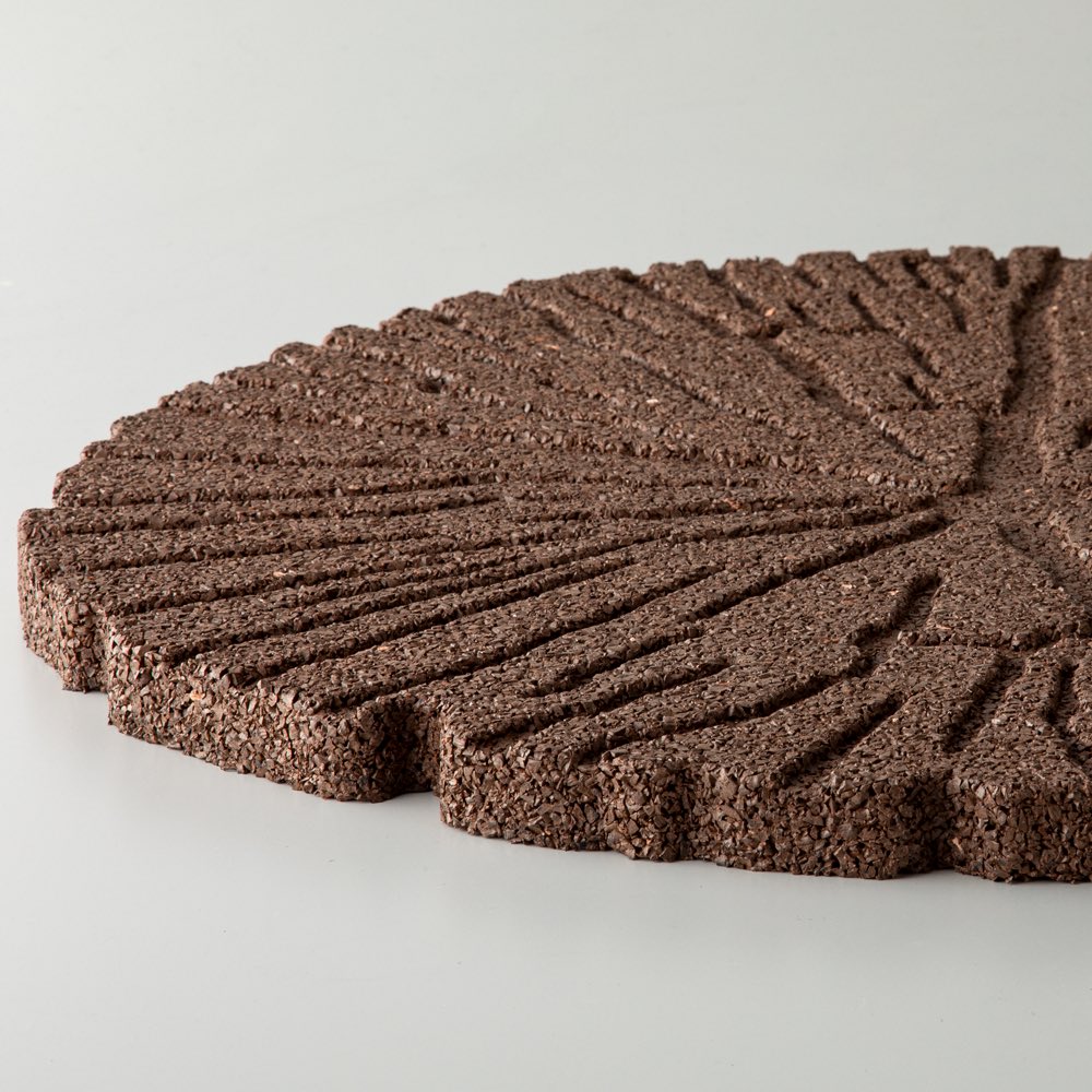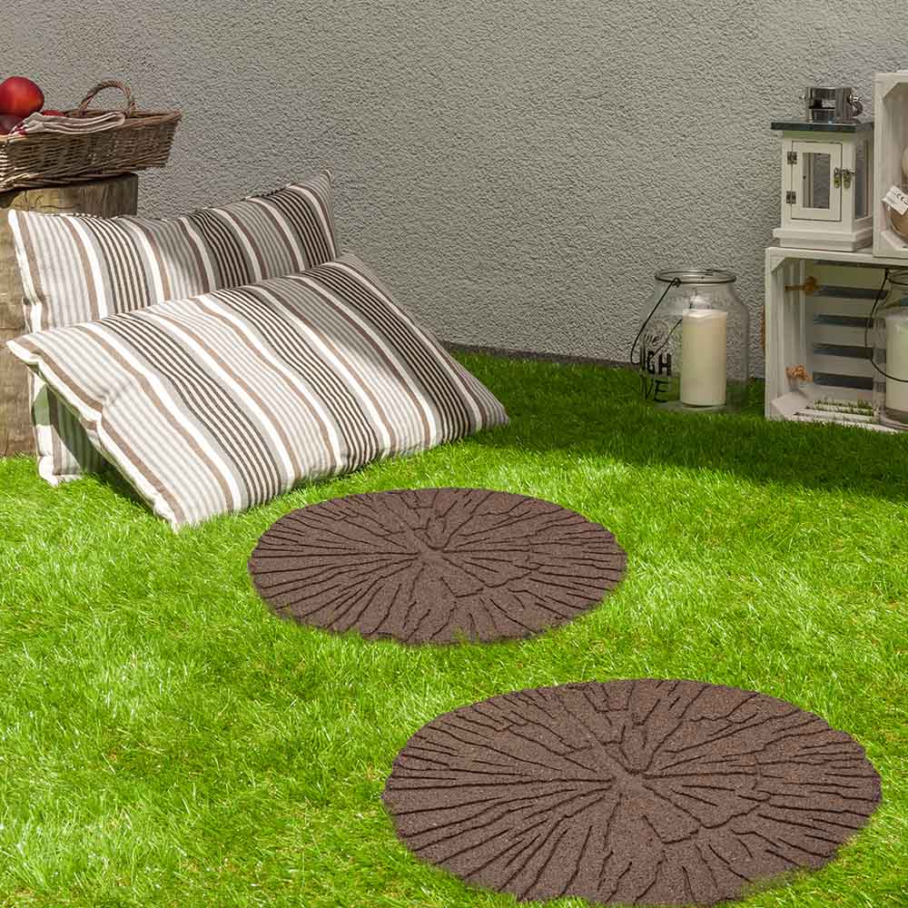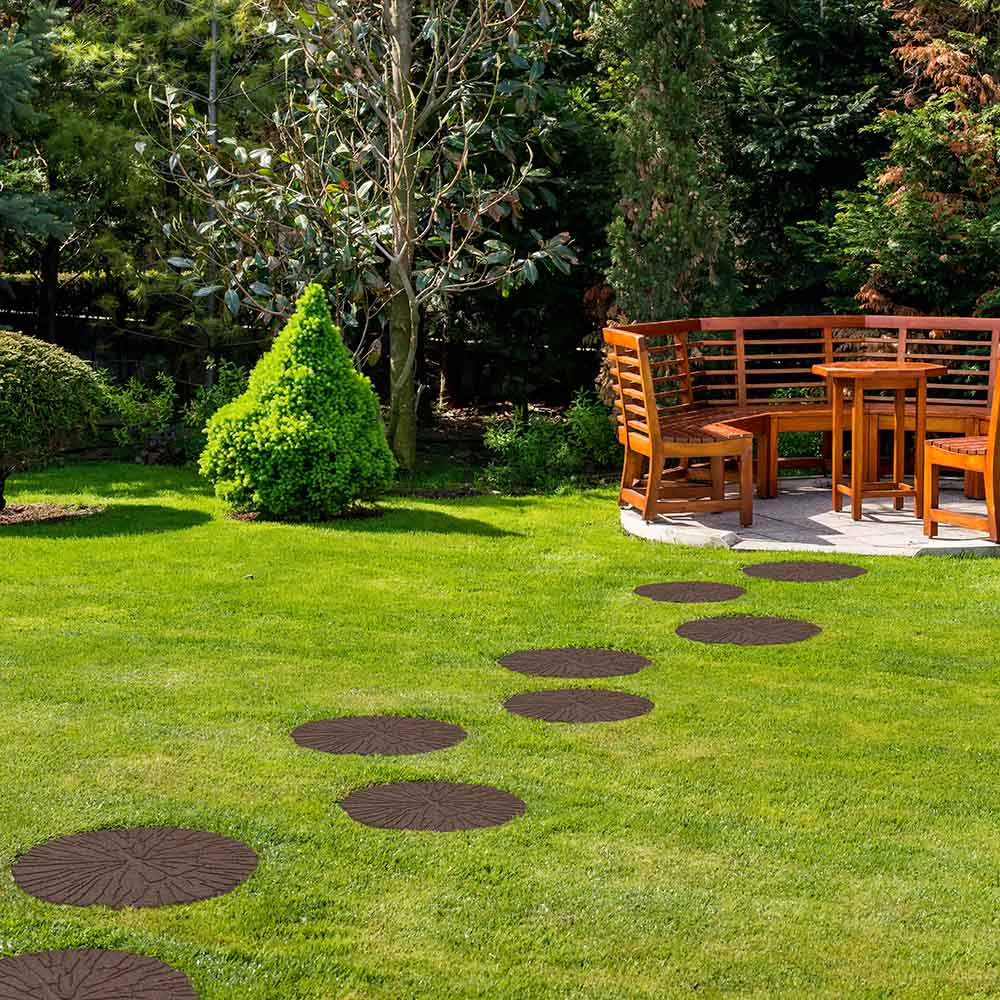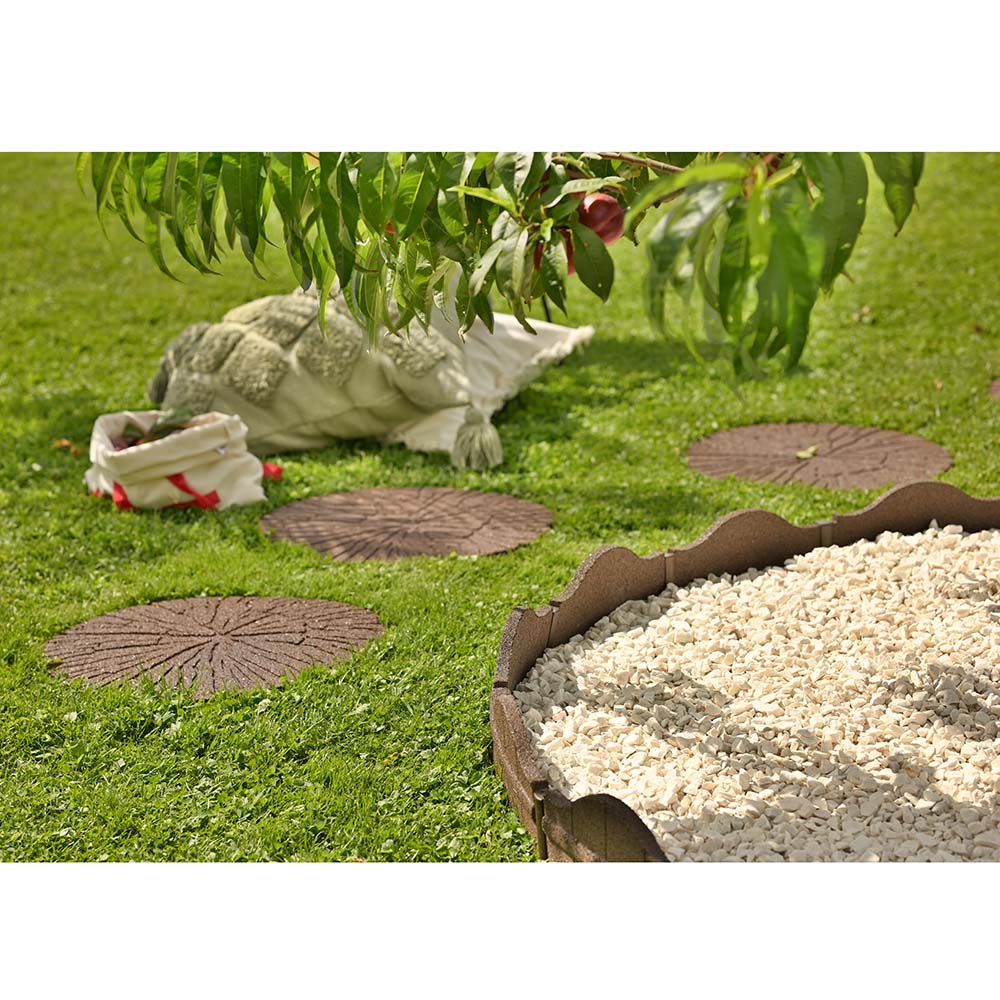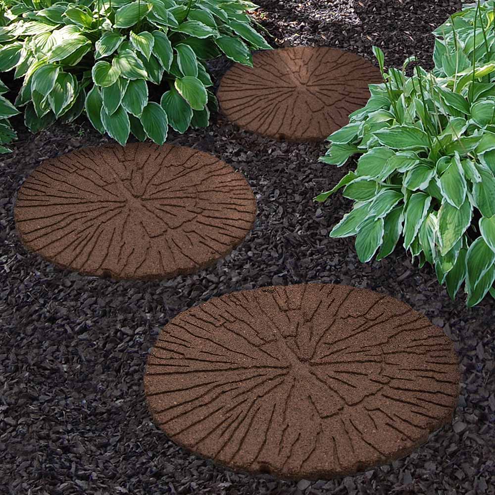輪切りの丸太を再現したステップ。連続して置くことでゾーニングができ、小さなドラマが生まれます。リサイクルラバー製だから踏んでも割れず、朽ちる心配もありません。