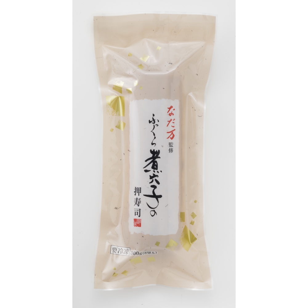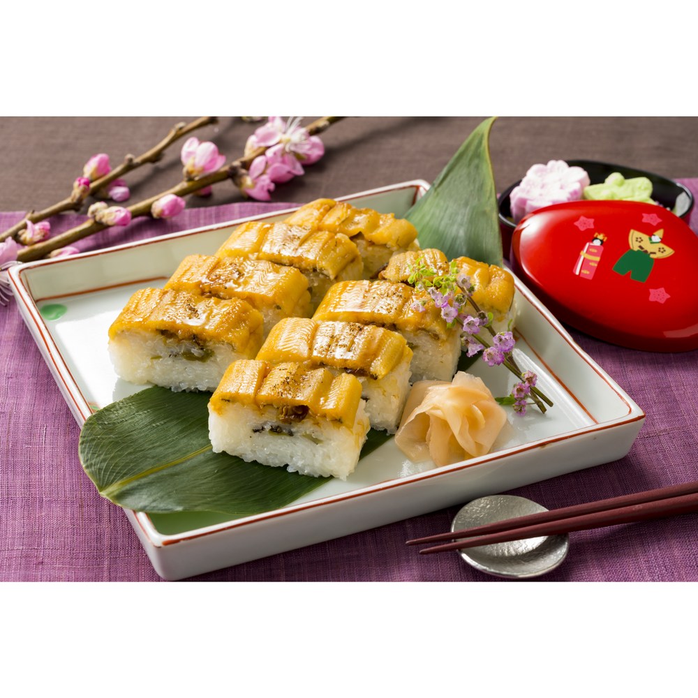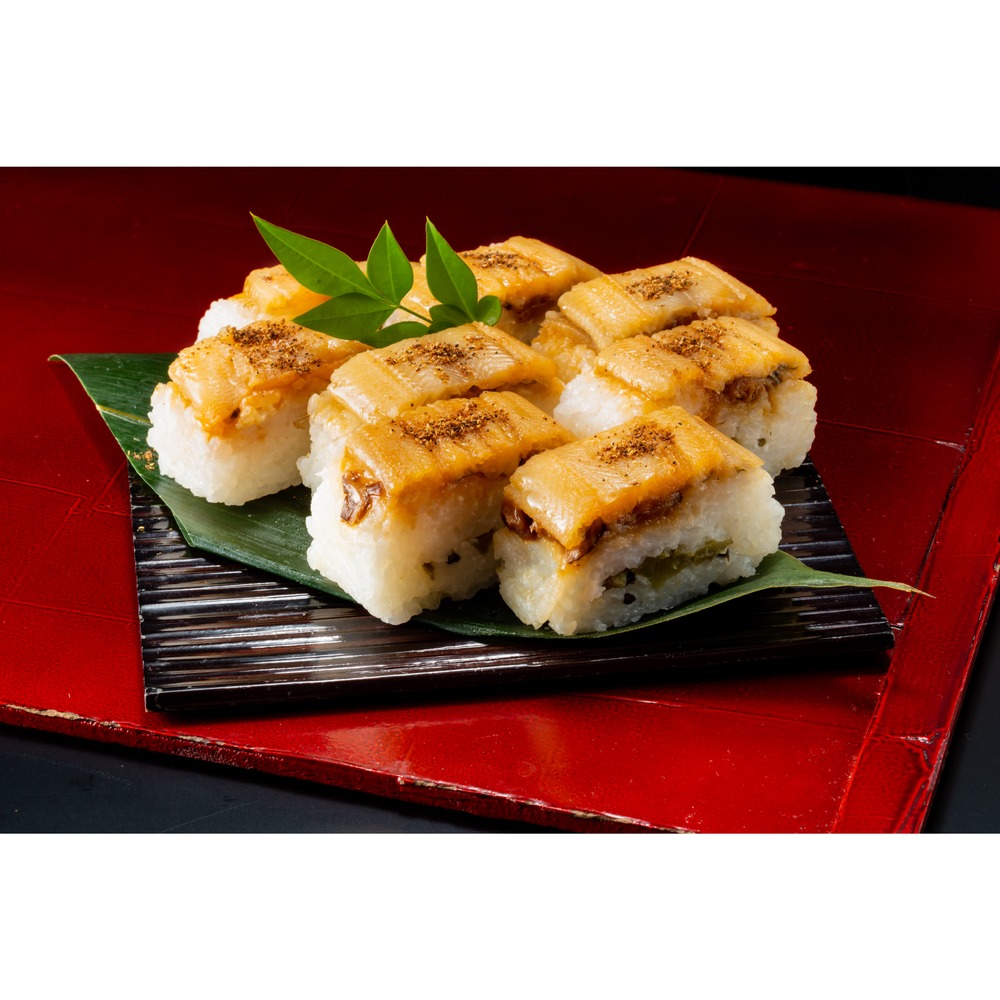香ばしく甘辛に煮込んだ煮穴子を使い、ふっくらと柔らかく仕上げた押寿司です。挟み込んだ椎茸煮と山くらげで旨味と食感を出しました。お好みで別添の山椒を付けてお召し上がりください。8切れにカット済みです。