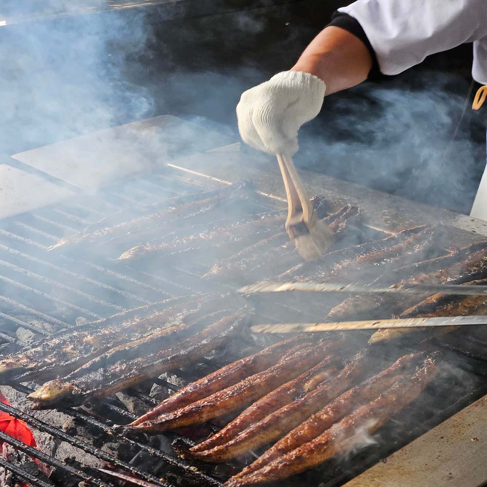 鰻一筋48年の江口さんと、焼き歴20年近くのお弟子さんで焼いています。「鰻の個体差を見極めて美味しくなるまで焼く」という工場製品では真似できない「手焼き職人の技」が美味しさを引き出します。