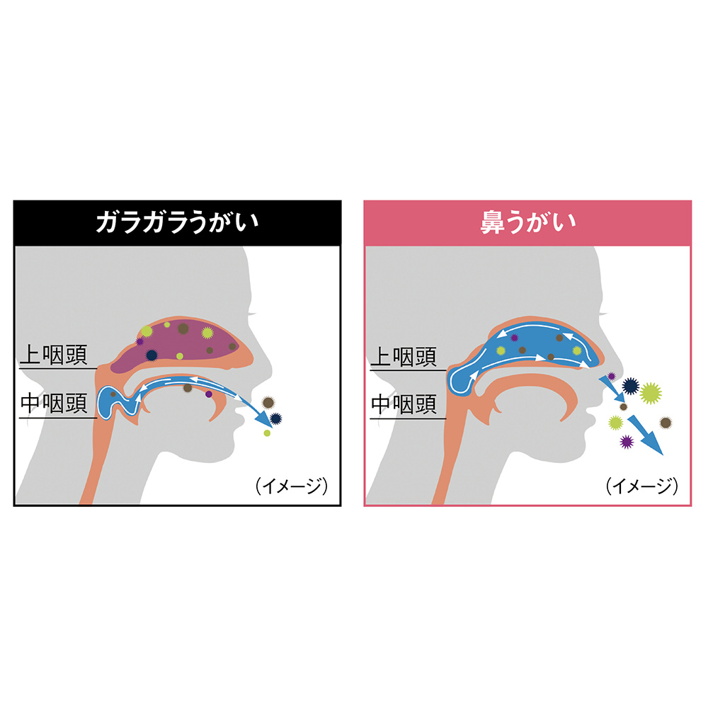 ガラガラうがいでは上咽頭・鼻腔は洗い流せない!