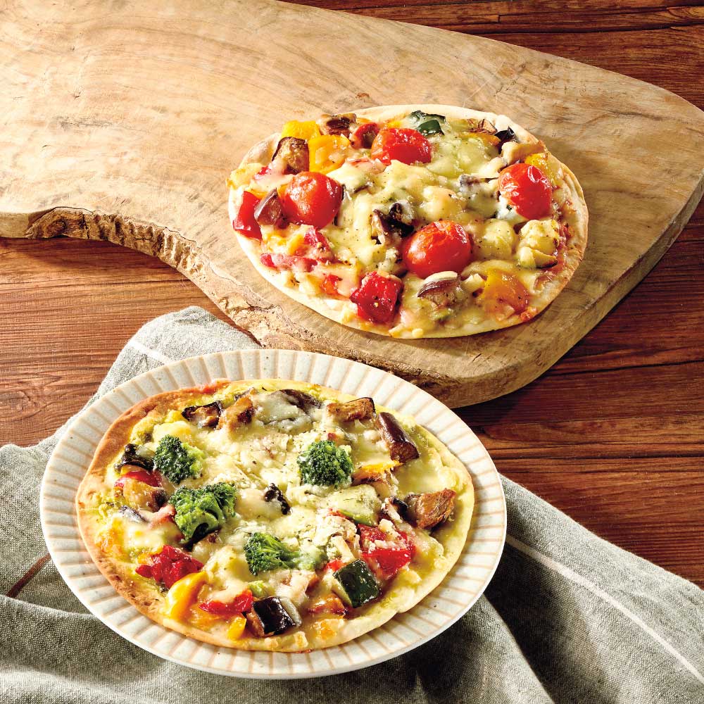 薄生地のピザに野菜の具材感とたっぷりチーズ。野菜が多いのにしっかりしたピザの味をお楽しみいただけます。トマト、ジェノベーゼ風の2種類をご用意。