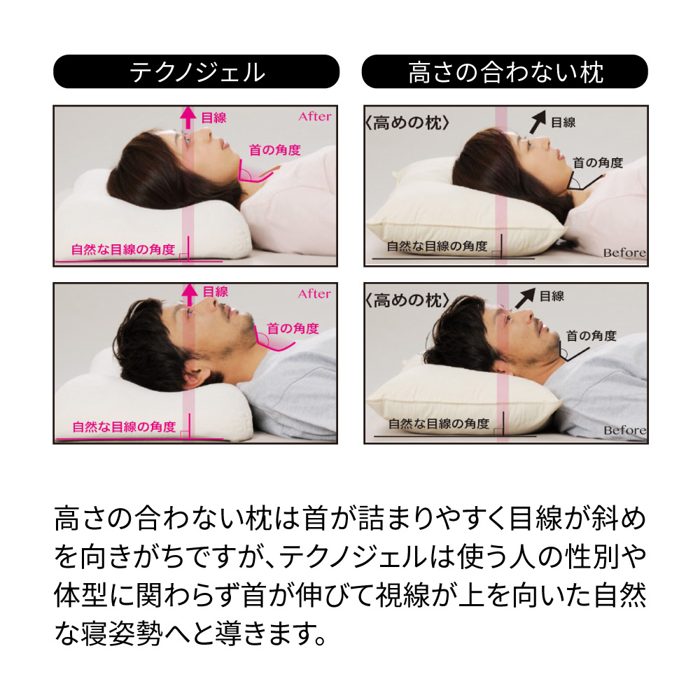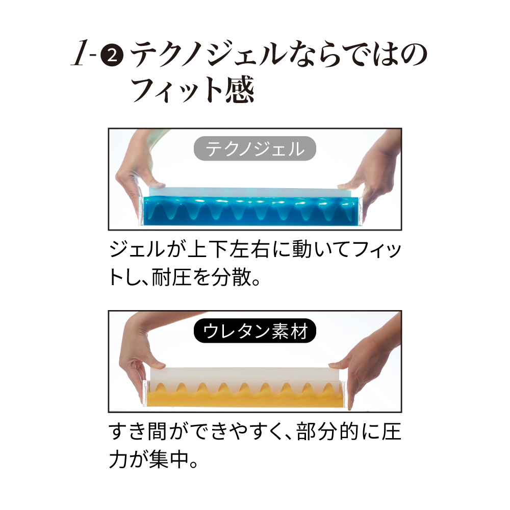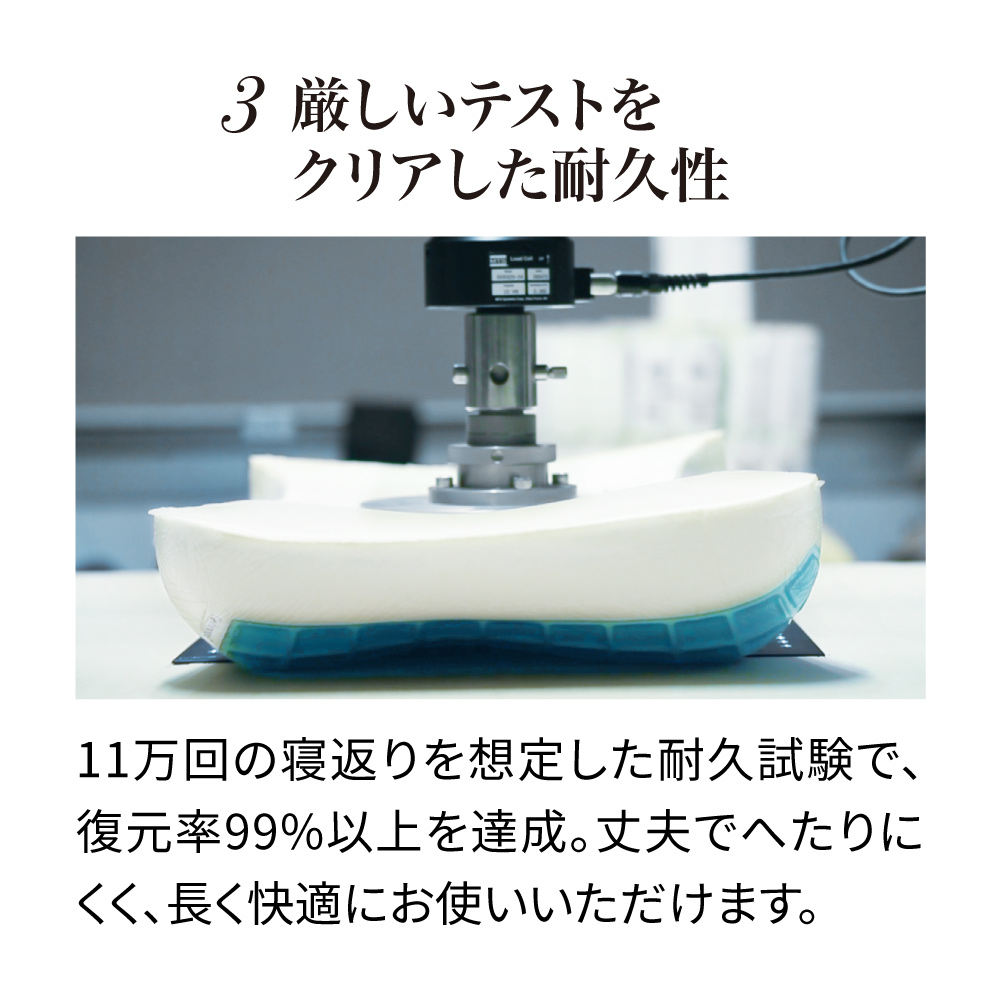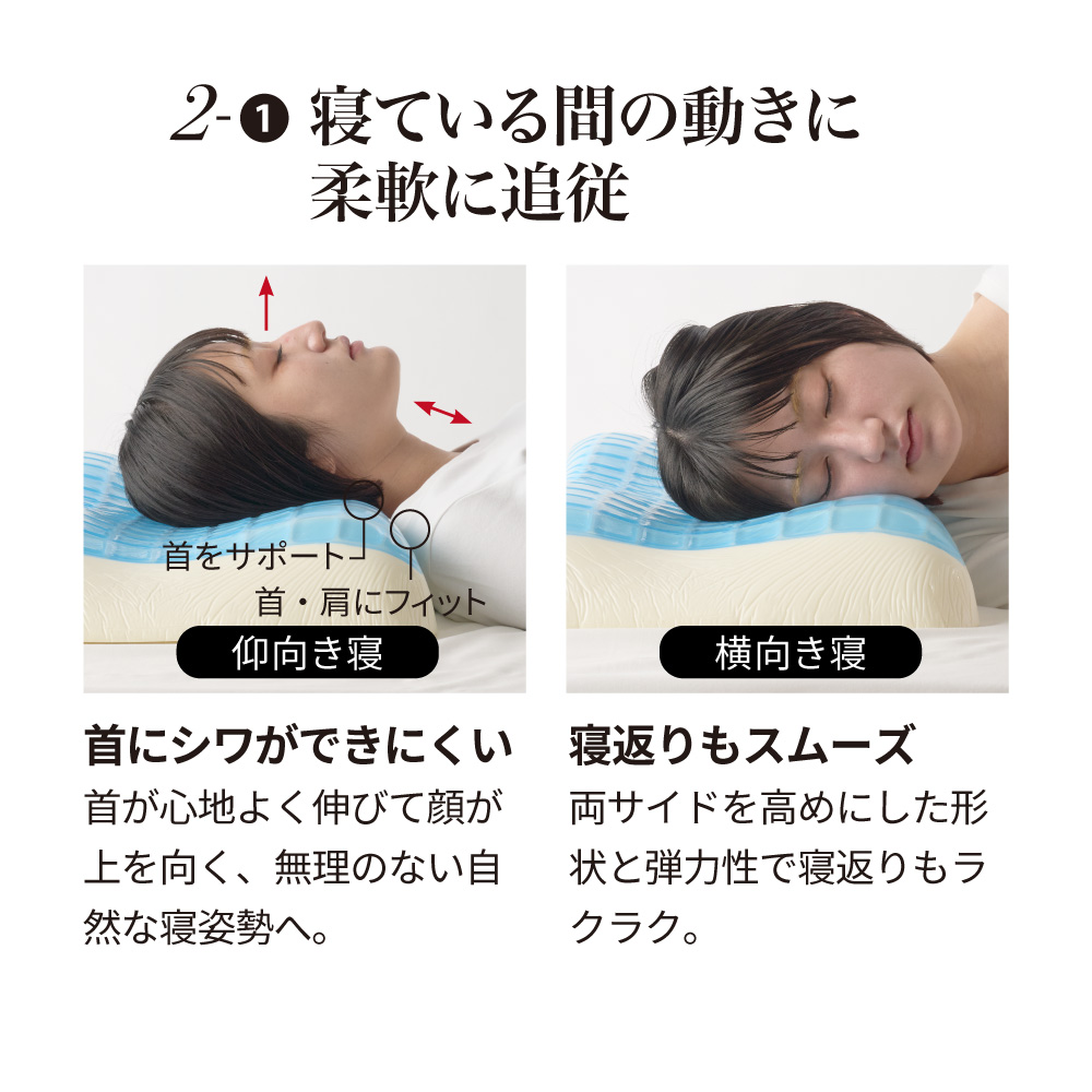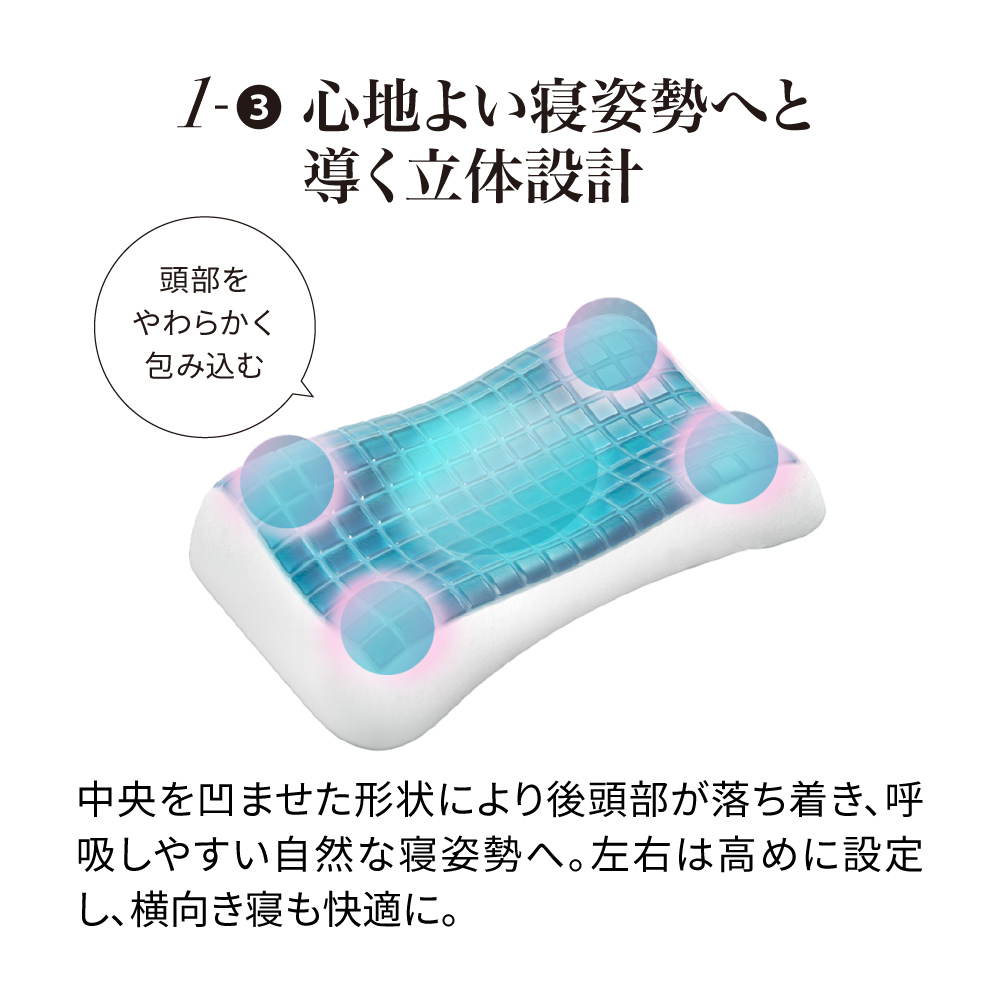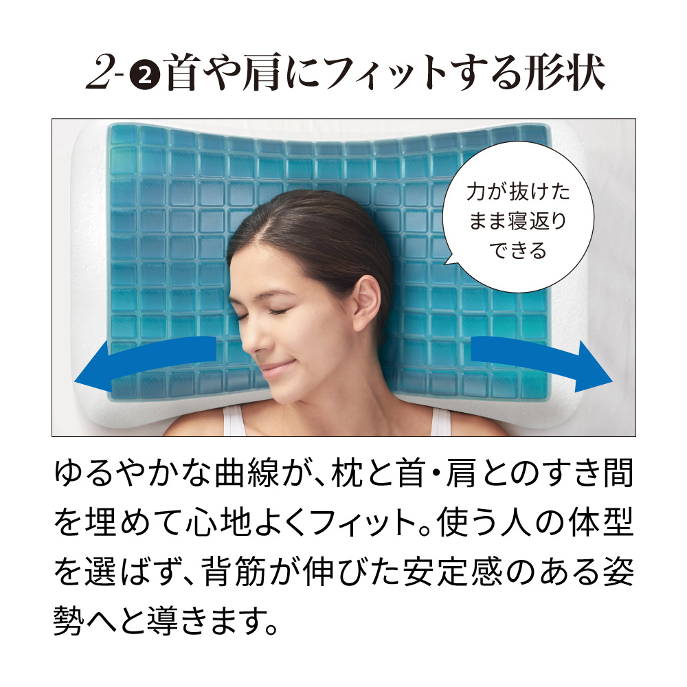 人体に寄り添うゆるやかなカーブ形状。頭・首・肩を支えるエリアにジェルを敷き詰め、様々な寝姿勢でも心地よく。